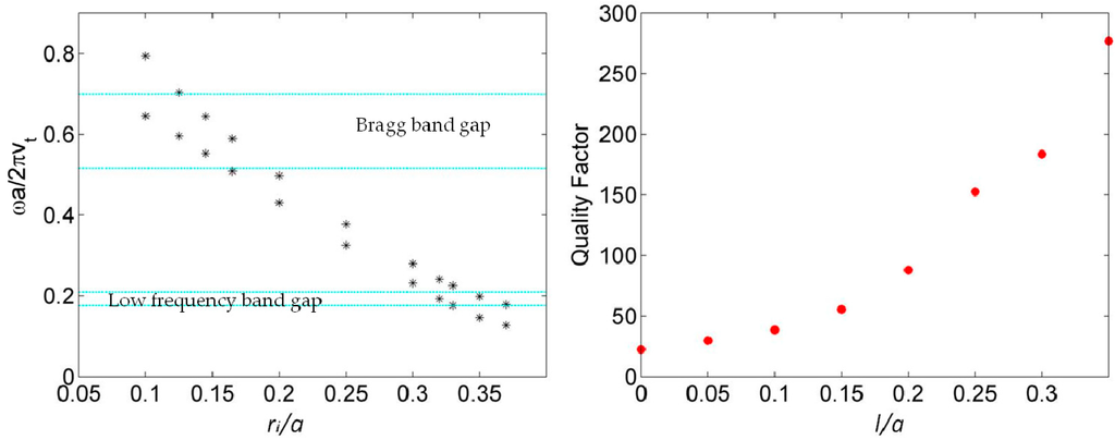 Figure 3 (left panel) presents the evolution of the two WGMs as a function of the inner radius of the hollow pillar. Both WGM frequencies decrease when increasing the inner radius. Indeed, it is noteworthy that a higher value of the average radius <r> = (r + ri) 2 of the shell around the hollow increases the acoustic path along the perimeter 2π<r> of the cylinder. As a result, when ri/a = 0.145 (resp. 0.35), the WGM ‘1’ and ‘2’ fall in the middle of the Bragg (resp. low frequency) gap [22]. We also calculate the corresponding quality factor for the WGM 1, Q = f/Δf, where f is the central frequency of the pass band and Δf is the full width at half maximum of the transmission peak. The right panel of Figure 3 shows a significant increase in the quality factor when increasing the reduced height l/a of the pillar basis. For l/a = 0.35, the quality factor is Q = 280, which is more than 10 times the value obtained without the additional cylinder, paving the way to a high resolved narrow pass band device for filtering applications [22].