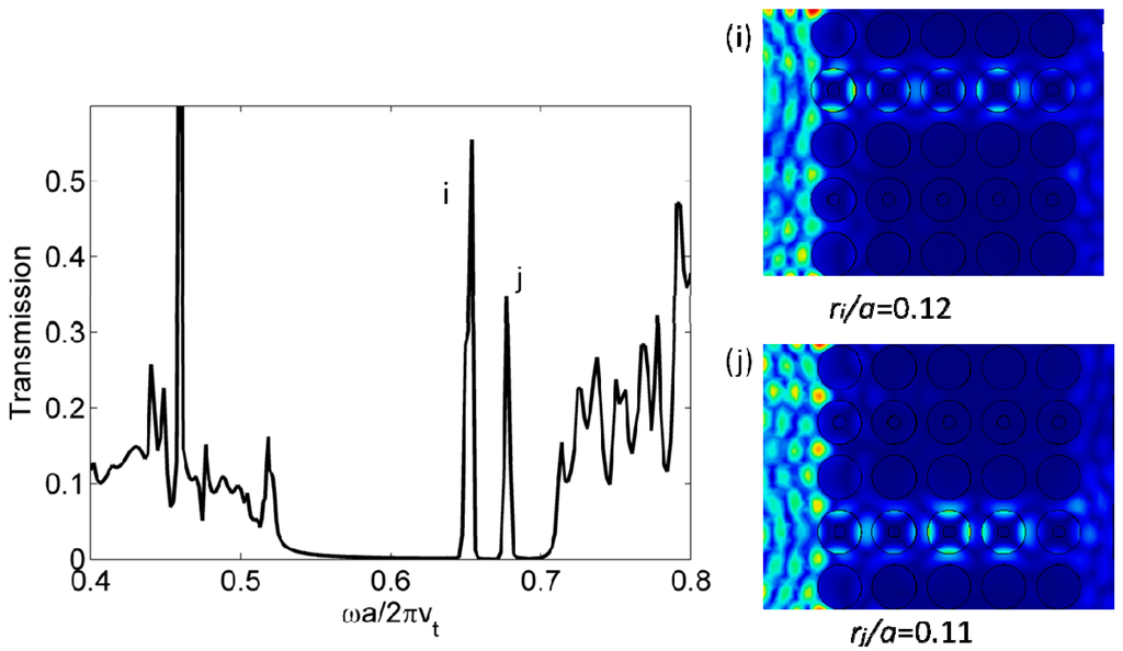 The WGMs with high quality factors are applied to different kinds of multiplexers, based on monochannel or multichannel waveguides or cavity. In Figure 4, we show a multichannel waveguide consisting of waveguide i with inner radius ri/a = 0.12 and waveguide j with inner radius rj/a = 0.11. The transmission peaks for waveguide i and j are located at reduced frequency 0.654 and 0.678, respectively. In addition, an efficient subwavelength waveguide is also demonstrated, as the WGMs can be tuned in the low frequency band gap [22].