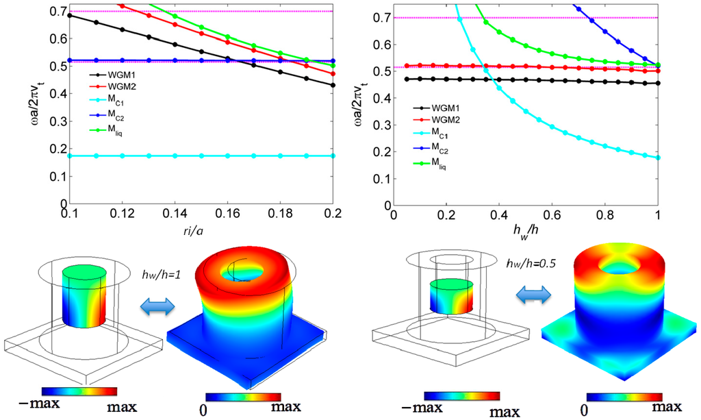 In Figure 7, the hollow pillar filled with water has geometric parameters as h/a = 0.4, r/a = 0.39, ri/a = 0.1, hw/h = 1, and l/a = 0.1. The first and the second compressional liquid frequencies are fc1 = 0.197 and fc2 = 0.587, corresponding to a wavelength λc1/h = 4 and λc2/h = 4/3, respectively, as shown clearly in the pressure distributions in the left panel. The set of geometric parameters are chosen to move the WGMs to higher frequencies outside of the Bragg band gap. From the right panel, the first compressional liquid mode is at the edge of the low frequency band gap while the second one is in the middle of the Bragg band gap. We focus on the second compressional liquid mode, as the Bragg band gap is broader and has more potential in the applications.