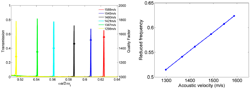 The Mc2 in the Bragg band gap is isolated, allowing a phononic sensor application to sense the probed parameters on a sufficiently broad frequency range. The efficiency of the phononic sensor is detected by changing the physical properties of the filled liquid in the hollow pillar. Six kinds of liquids are employed to test the efficiency [9,10]. Figure 8 left panel presents the evolution of the Mc2 induced transmission peaks as a function of the acoustic velocity. It is observed that the transmission peaks are very sensitive to the acoustic velocity of the infiltrated liquid, with high quality factors Q = f/Δf larger than 1000. Figure 8 (right panel) shows the relationship between the frequency of transmission peak and the corresponding acoustic velocity. In order to qualify the sensitivity, a common measurement is to calculate the slope of the lines in the right panel, named sensitivity S, as S = Δf/Δc, where Δf is the difference of the reduced frequencies of two infiltrated liquids and Δc = (cliqi − cliqj)/vt is the difference of the reduced velocities of two infiltrated liquids by dividing the transverse velocity of silicon vt to have a dimensionless quantity. The average of S is 1.761, with a deviation 2.53% for the minimum and 0.87% for the maximum.