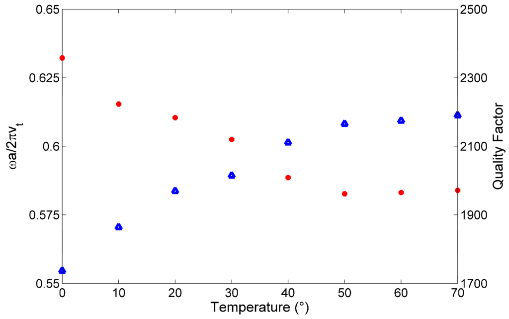 Varied frequencies (blue triangular dots) and corresponding quality factors (red circle dots) of the second liquid compressional mode by tuning the temperature of water in the holes. The geometric parameters are h/a = 0.4, r/a = 0.39, ri/a = 0.1, hw/h = 1, l/a = 0.1.