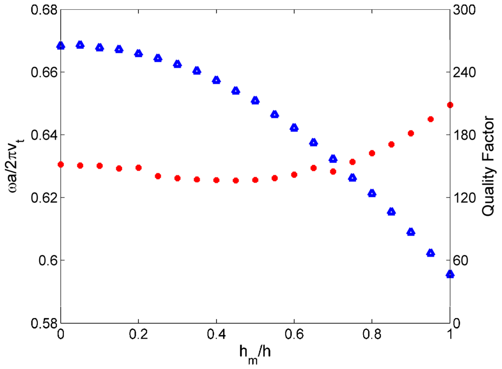 Due to the fact that the property of the liquid is easier to control than that of the solid, we can realize an active control of the PnC’s functionalities, such as waveguiding or sensing. In Figure 11, we present the evolution of the WGM1 frequency and its corresponding quality factor by changing the height of the fluid in the holes. To be specific, by increasing the height of mercury, the frequency of WGM1 moves to lower values, plotted in blue triangle dots, especially in the range hm/h > 0.4. The red dots show that the quality factor of WGM1 does not change too much within the range hm/h = [0; 0.6] and increases from 140 at hm/h = 0.6 to 210 at hm/h = 1. The regime where the WGM1 changes significantly with respect to hm is still located in the Bragg band gap, allowing for the realization of an actively tuned multichannel wavelength multiplexer.