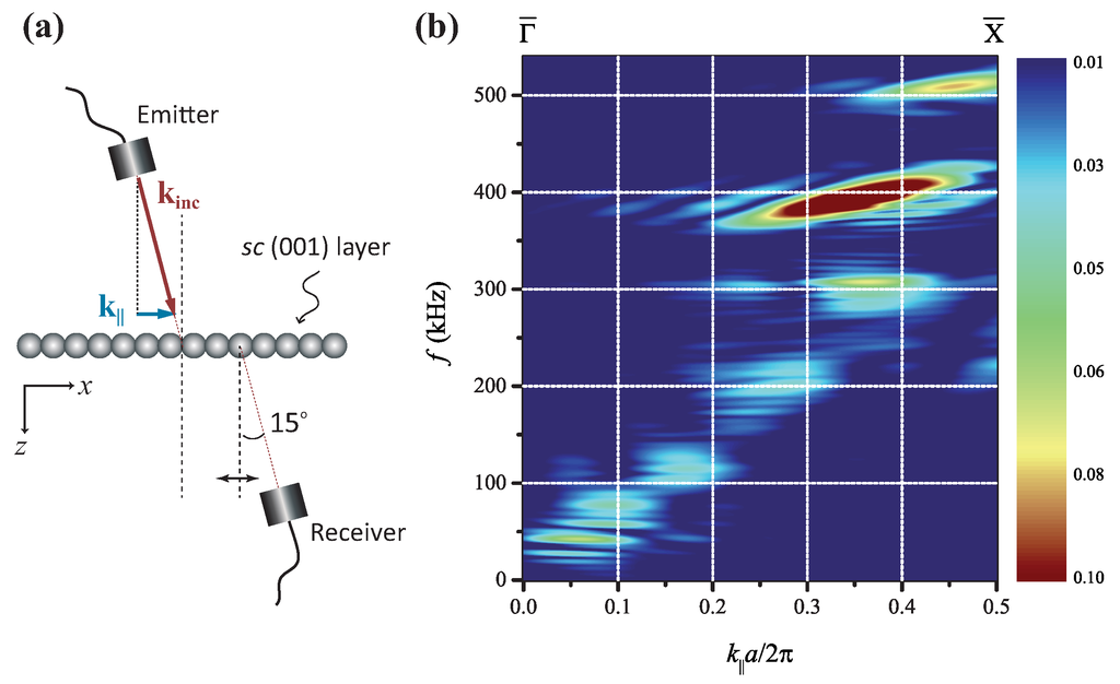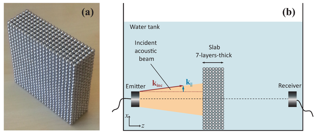 (a) the finite three-dimensional (3D) sc structure made of touching magnetic spheres of diameter , with dimensions , before its immersion in water; and (b) schematic representation of the experimental setup. The emitter-beam angular spreading (shaded region) is characterized by a wavevector component parallel to the (001) surface of the slab, , varying from zero (normal incidence) to a maximum value depending on frequency.