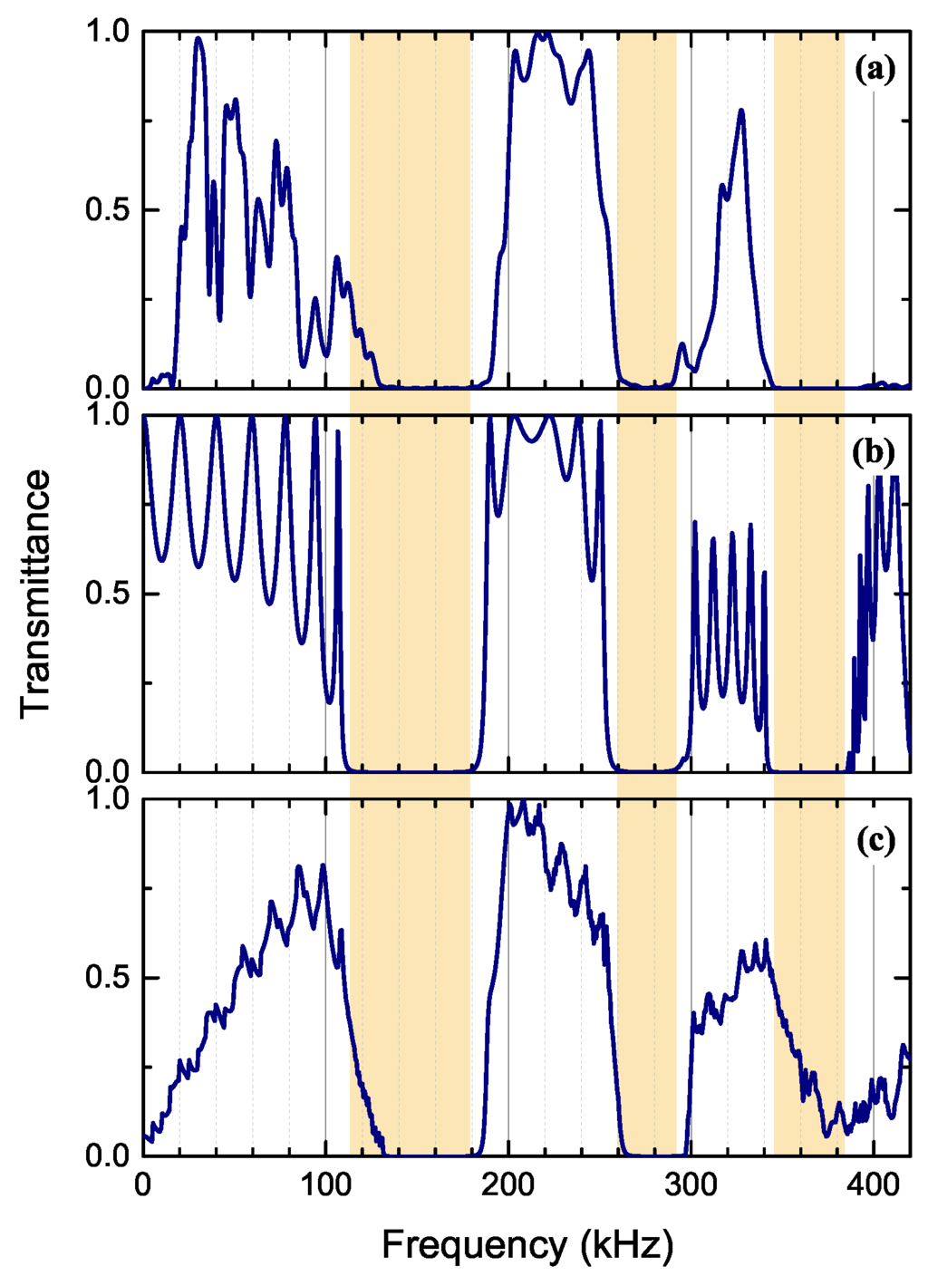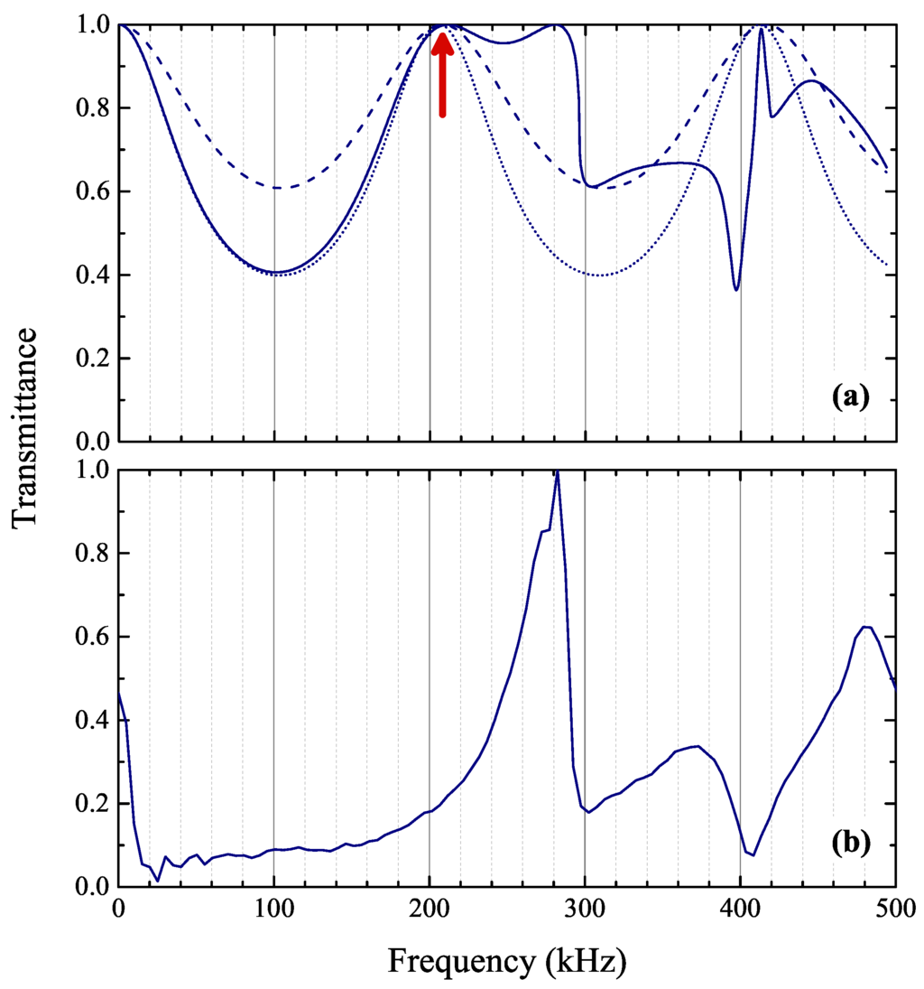 The experimentally obtained transmitted elastic field at the end of the chain, , in the low (kHz-range) frequency region is presented in Figure 7b, for chain lengths varying from 3 to 18 D5N35 beads (). One observes a Fabry–Perot (FP) type pass-band extending up to characterized by an, increasing with N, number of FP resonance peaks; the band is followed by a transmission-gap (shaded region in Figure 7b).