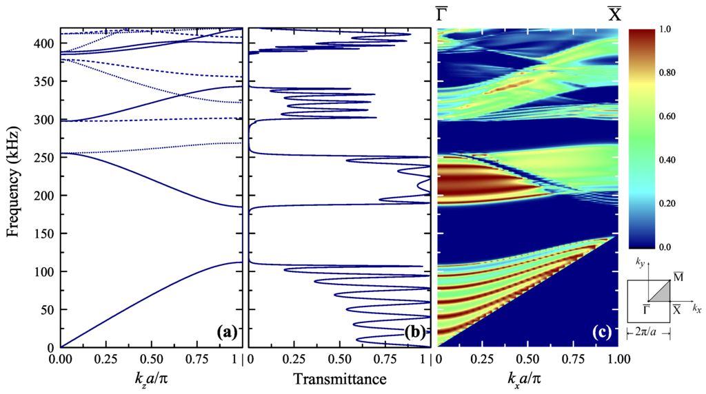 The ratio between the Fast Fourier transforms (using eventually zero-padded data in order to decrease the Fourier transform frequency step, and consequently increase the accuracy of the obtained spectra) of the signal transmitted through the slab and the signal transmitted without the slab, i.e., directly from the emitter transducer to the receiver, is formed to obtain a pseudo-transmission coefficient. The corresponding experimental transmittance spectrum is presented in Figure 2a. One observes three pass-band frequency regions separated by relatively large forbidden bands (transmission-gaps) extending from to , from to , and from to , these limits are found if a transmittance level is imposed. These are, in general, in accordance with multiple-scattering theoretical predictions [22], shown in Figure 2b. In the theoretical calculations, the sc (001) planes extend to infinity and a longitudinal acoustic plane wave is considered to be incident normally () on the structure. The main difference when comparing the plots (a) and (b) of Figure 2 is the absence of well constructed Fabry–Perot (FP) resonances in the experimental spectrum within the first transmission band extending up to . Additionally, the experimental gaps are slightly narrower and the whole transmittance spectrum is slightly shifted towards higher frequencies, with the first and second transmission bands leaking within the gap regions, as predicted from the theoretical calculations at normal incidence (Figure 2b). A possible explanation could be the simultaneous generation of several incident waves with different components and amplitudes, due to the angular spreading of the emitter transducer beam, as schematically displayed in Figure 1b. An attempt to reproduce this behavior, theoretically, is given in Figure 2c. We sum the transmittances corresponding to several components along the direction, precisely over , where q varies from 0 to with a step of . Next, we normalize the total-sum curve with respect to its maximum value within the frequency window of interest. The obtained curve mimics quite successfully the behavior of the experimental spectrum at the edges of the two first transmission-gaps. As we move towards higher frequencies, the effect of the transducer-beam angular spreading should weaken, the angular spreading being proportional to the emitted wavelength. This approach does not constitute of course a rigorous proof, especially that the sum should be performed by integrating over the whole irreducible part of the surface Brillouin zone (see Figure 3). Here, we used for simplicity only a part of the direction to match the upper frequency limit of the first transmission band. A complete picture of the transmittance along the whole direction is given in Figure 3.