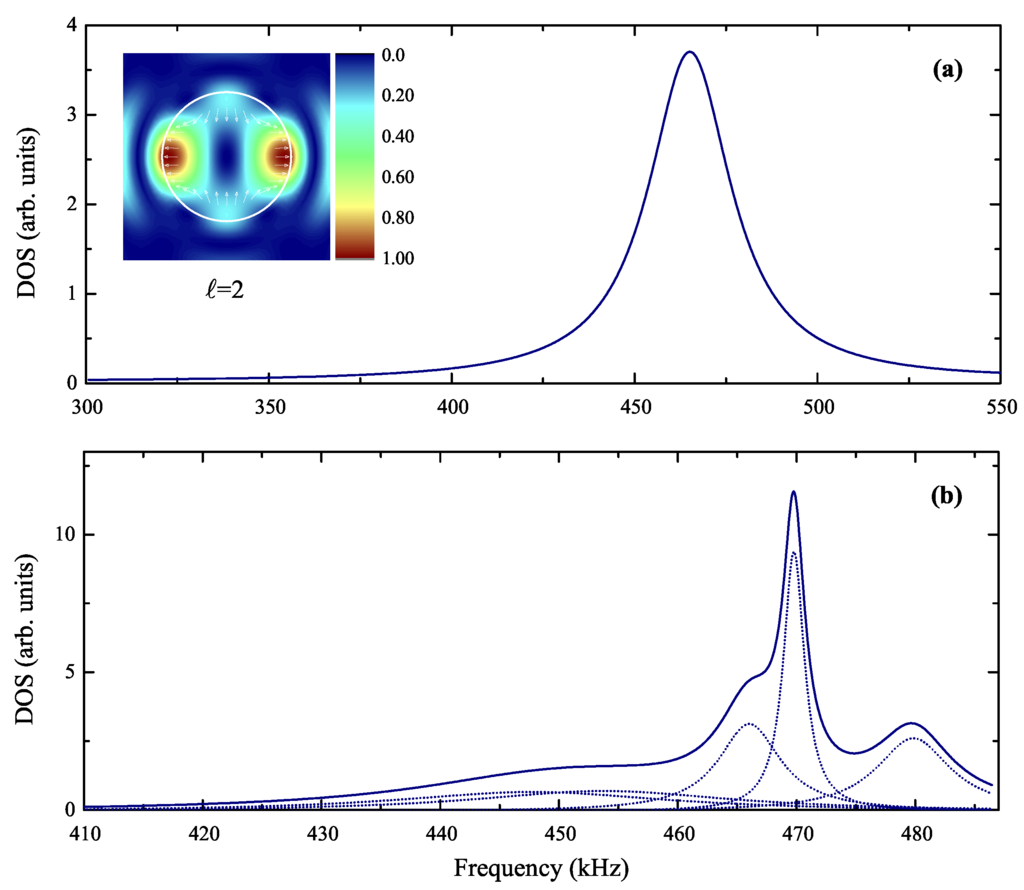(a) calculated difference in the density-of-states of the elastic field for a D5N35 sphere (diameter ) immersed in water, with respect to the infinitely extended host medium (water), revealing an five-fold resonant mode. In the inset, we give, after extraction of the incident component, the color map of the modulus of the elastic field at resonance (), in a plane passing at the center of the sphere (incidence is assumed along the horizontal axis directed from left to right); the white arrows show the direction of the elastic field; and (b) calculated difference in the density-of-states of the elastic field for a square array of touching D5N35 spheres (diameter ) immersed in water, with respect to the infinitely extended host medium (water) for , revealing the splitting of the five-fold resonant modes of the individual sphere to five non-degenerate modes (dotted lines).