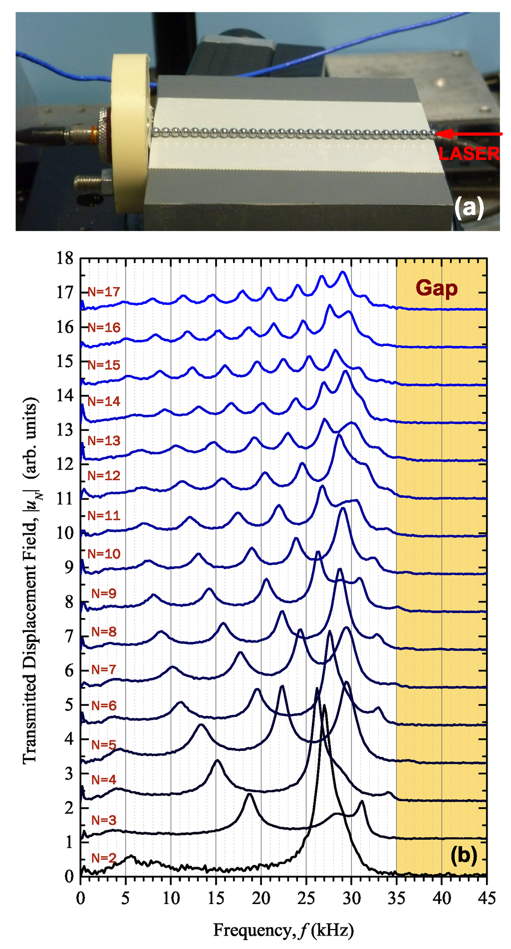 (a) chain of N metallic spheres of diameter , excited by a longitudinal transducer (left) with the transmitted signal recorded at the end of the chain through LDV (right); (b) the modulus of the transmitted displacement field measured at the end of the chain, , as a function of frequency f, for various chain lengths, . The different spectra are displaced vertically to improve visibility.