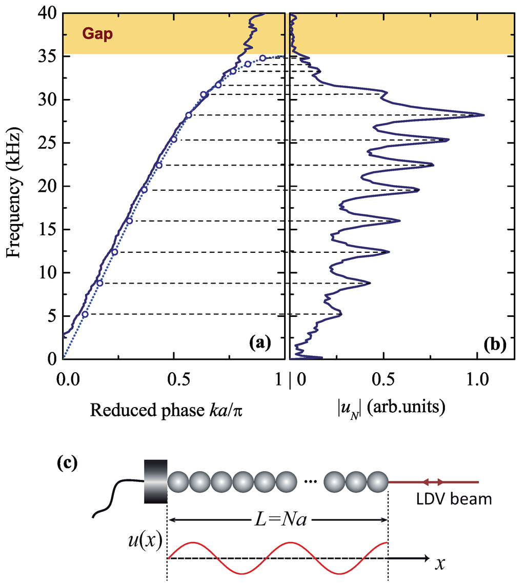 (a) experimental dispersion plot of a linear chain of lattice parameter a, made of N touching spheres (diameter ) deduced from the FFT phase (solid line) compared to a discrete model description represented by the pairs with (open symbols). The dotted line is a non-linear interpolation connecting the discrete points , revealing a clear propagative band ranging from 0 to ; (b) experimental transmitted displacement field spectrum for the case of a finite chain (). Horizontal dashed lines are guides to the eye, associating the frequency positions of the FP resonance peaks, , to the discrete wavenumbers , for the case of spheres (see text); (c) a schematic representation of the FP resonances in the linear chain configuration with open-closed boundary conditions applied at the extremities of the chain.