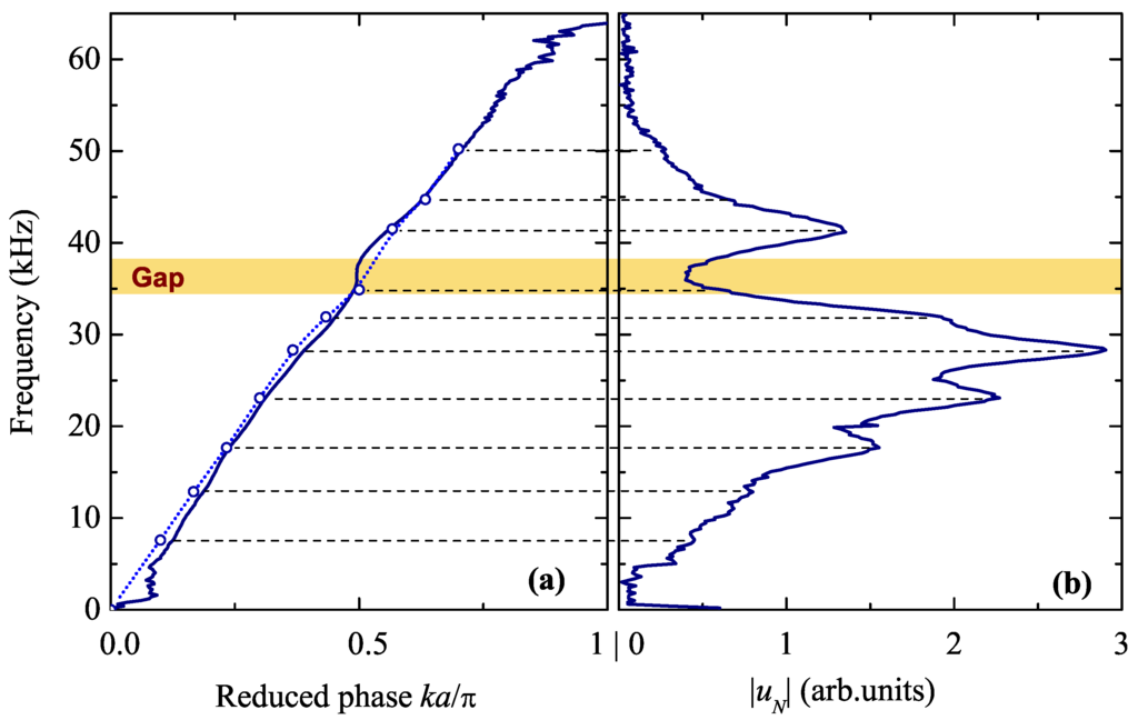 (a) experimental dispersion plot of a linear chain of lattice parameter a, made of N touching spheres (diameter ); (b) experimental transmitted displacement field spectrum for the case of a finite chain (). All symbols, methods and analysis follow the same scheme as the one used in Figure 8.