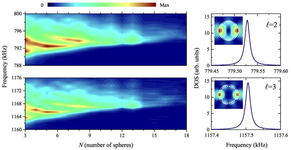 As expected from the linear chain image, described previously, no higher propagative bands exist beyond the cut-off frequency of the acoustic branch. However, at higher frequencies (MHz-range), localized flat resonant modes are expected to appear; they propagate along the chain, originating from the corresponding resonances of the individual sphere. For a chain made of spheres with , we experimentally observe the formation of narrow, high-amplitude resonant bands around the and resonances of spheroidal modes of the individual sphere, as confirmed by DOS calculations and a multipole mode analysis for the system [22,28]. These bands are centered at and , respectively, as shown in the left panel of Figure 10; the theoretical calculation (right panel of Figure 10) predicts and , for the individual sphere, if the elastic parameters of Table 1 are used. Similar results are found for chains made of D5N35 and D10N42 spheres, confirming this high-frequency-response image.