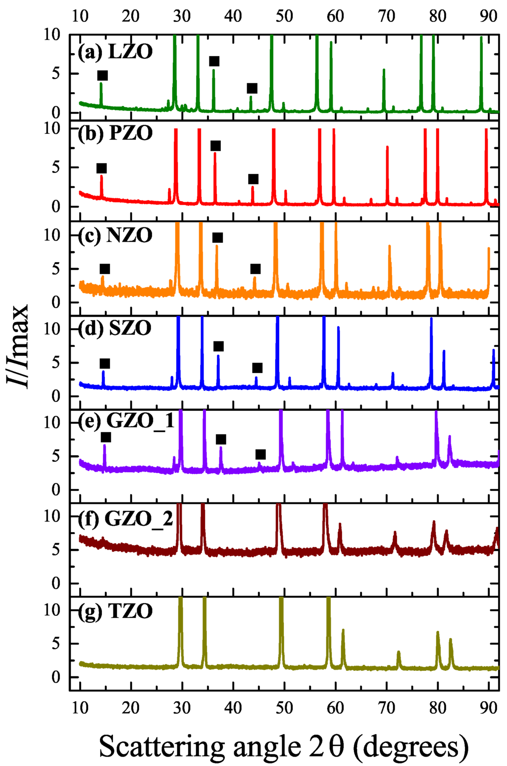(a–g) Room temperature X-ray diffraction patterns of polycrystalline samples of (with La → Tb) plotted to show the low intensity Bragg peaks. The experimental profiles are given in relative intensities as a function of the scattering angle 2θ. LZO (a); PZO (b); NZO (c); SZO (d); and GZO_1 (e) samples have a cubic pyrochlore structure (”■” indicate the low angle superlattice reflections of the pyrochlore structure). GZO_2 (f) and TZO samples (g) crystallize in the cubic defect-fluorite structure. The two samples were prepared using the different synthesis conditions given in Table 3.