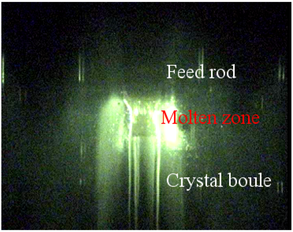 Floating zone growth of a boule of in air at a growth rate of 12.5 mm/h.