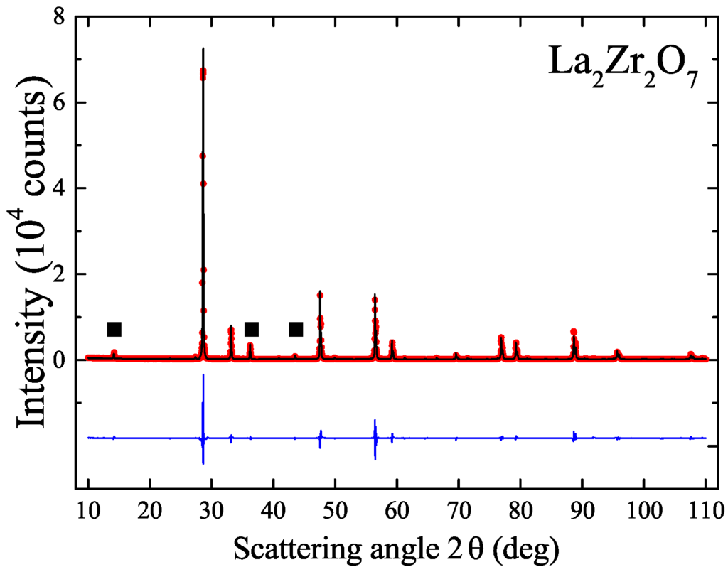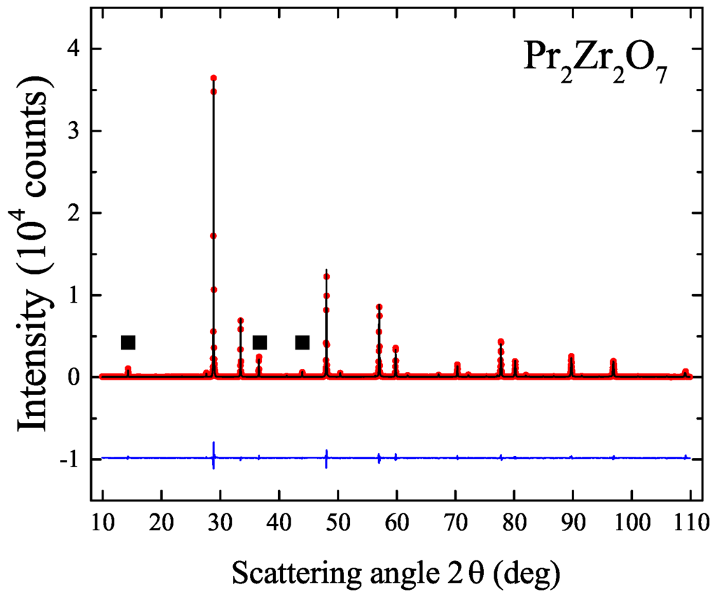 Powder X-ray diffraction profile of a ground crystal of prepared in oxygen, at 4 bars pressure and using a growth rate of 8 mm/h. The experimental profile (red closed circles) and a full profile matching refinement (black solid line) to the pyrochlore structure are shown, with the difference given by the blue solid line. ”■” indicate the low angle superlattice reflections of the pyrochlore structure.