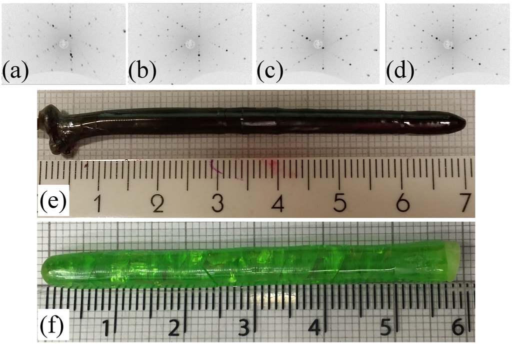 (a–d) Laue photographs of one of the facets of a crystal, taken along the crystal length at ∼15 mm intervals, between the beginning (left) and the end (right) of the boule shown in (e). The corresponding Laue patterns taken on the facet at 180 degrees are mirror images of these patterns. (e) Boule of prepared by the floating zone method in air at a growth rate of 12.5 mm/h. (f) Boule of prepared by the floating zone method in argon, at 1 bar pressure and using a growth rate of 12.5 mm/h.