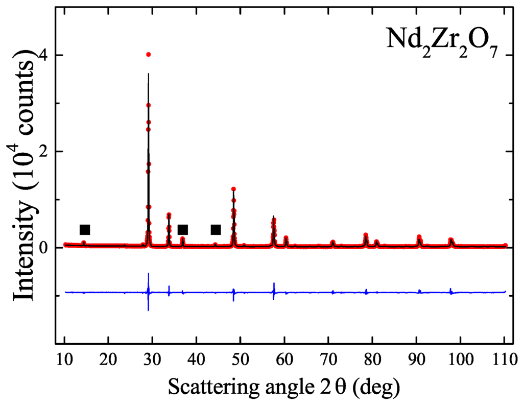 - Payne, J.L.; Tucker, M.G.; Evans, I.R. From fluorite to pyrochlore: Characterisation of local and average structure of neodymium zirconate, Nd2Zr2O7. J. Solid State Chem. 2013, 205, 29–34. [Google Scholar] [CrossRef]