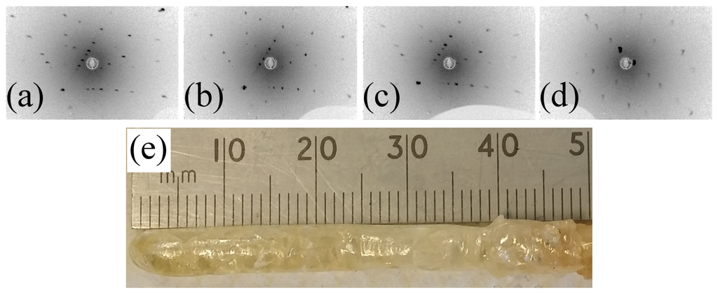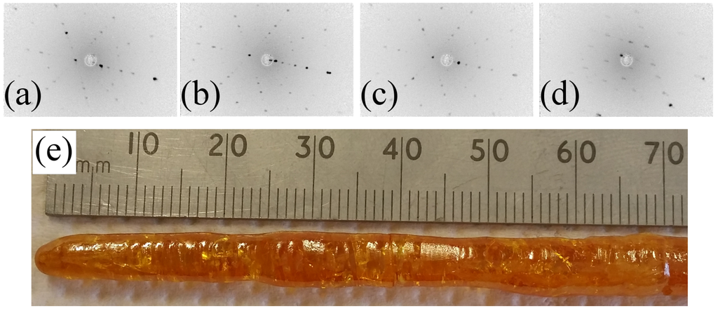 (a–d) Laue patterns of one of the facets of a crystal, taken along the crystal length at ∼15 mm intervals, between the beginning (left) and the end (right) of the boule. The corresponding Laue patterns taken on the facet at 180 degrees are mirror images of these patterns; (e) Crystal of grown in air at a rate of 12.5 mm/h.