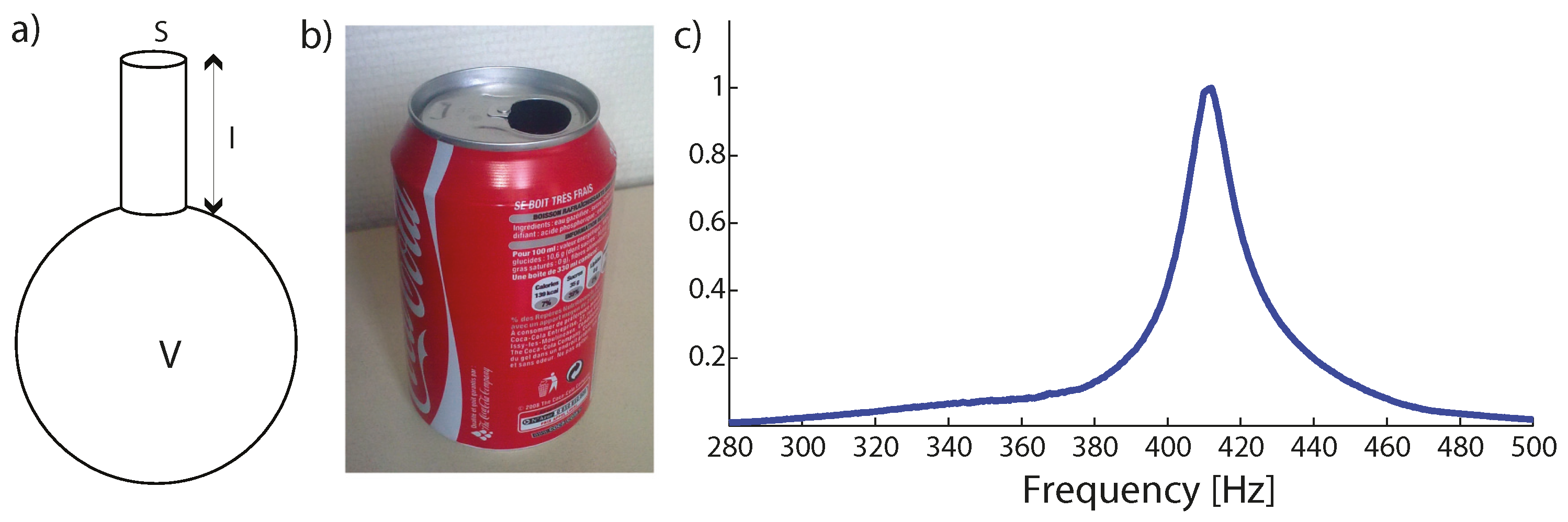 (a) A basic Helmholtz resonators with the important parameters; (b) The chosen experimental resonator: A soda can; (c) Experimental measurment of the resonance frequency measured with a microphone inside the can.