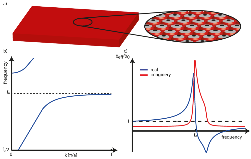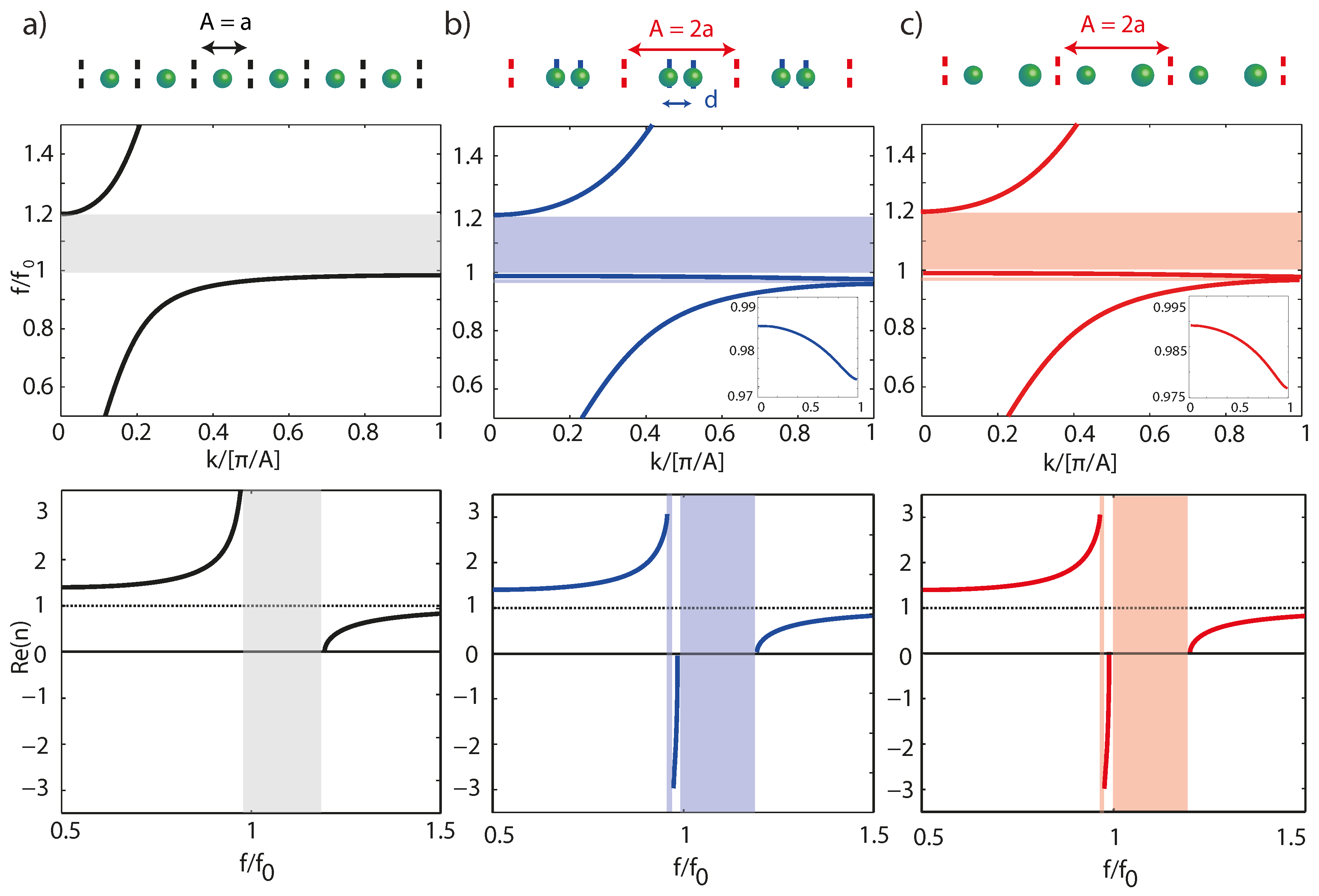 From this single negative medium, two new configurations are created just by breaking the symmetry in two different ways: either a bi-periodic chain is built by off-centering one resonator out of two, or a bi-disperse one is generated by slightly shifting the resonance frequency of half of the resonators. In both cases, we again analytically calculate the dispersion relation and extract the corresponding effective refractive index (Figure 8b,c). Both of the new symmetry broken metamaterials now exhibit, in the band gap of the single negative medium, a new propagating band that is characterized by a negative phase velocity.