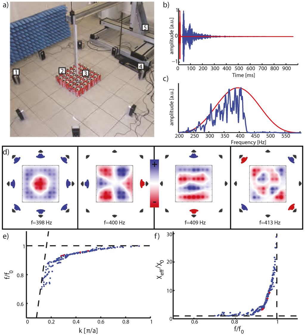 (a) Experimental setup: 8 commercial computer speakers (1) are controlled using a multi-channel soundcard (4) and create sounds exciting the soda cans metamaterial (2). Mounted on a 3D moving stage (5), a microphone records the pressure field; (b) Typical emitted pulse (red) and the measured signal (blue) on top of one can and their spectra (c); (d) Measured monochromatic patterns at distinct frequencies and with different emitting patterns; (e) Experimental dispersion relation and its equivalent in terms of effective compressibility (f).