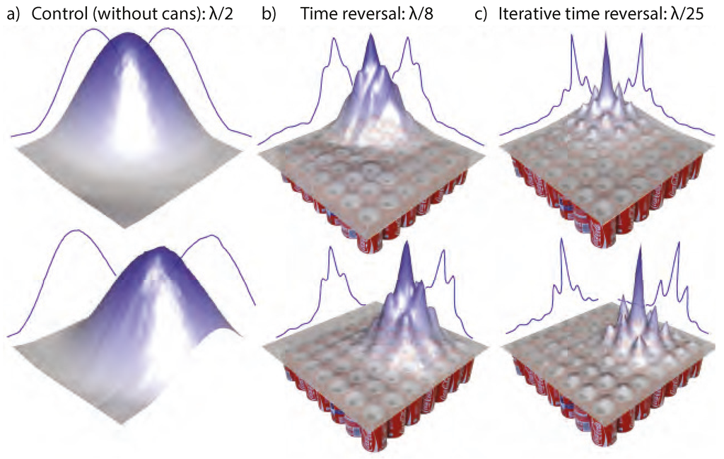 The same procedure in the presence of the cans is then performed. This time, the set of emitting signals span a longer time range as a signature of the modes resonances and the time reversal permits to synchronize at the desired location and at the desired time all of the eigenmodes that are non-zero. This results in a spatio-temporal focusing of the acoustic waves. The measure of the focal width is as thin as (Figure 4b), far beyond the diffraction limit. This is a consequence of the subwavelength nature of the modes inside the metamaterial. This experiment clearly shows that thanks to the resonant nature of the eigenmodes trapped inside the metamaterial, the conversion from free space wavelength to subwavelength varying fields is guaranteed. This permits to beat the diffraction limit from the far field and to focus waves on a thinner scale compared to the free space wavelength.