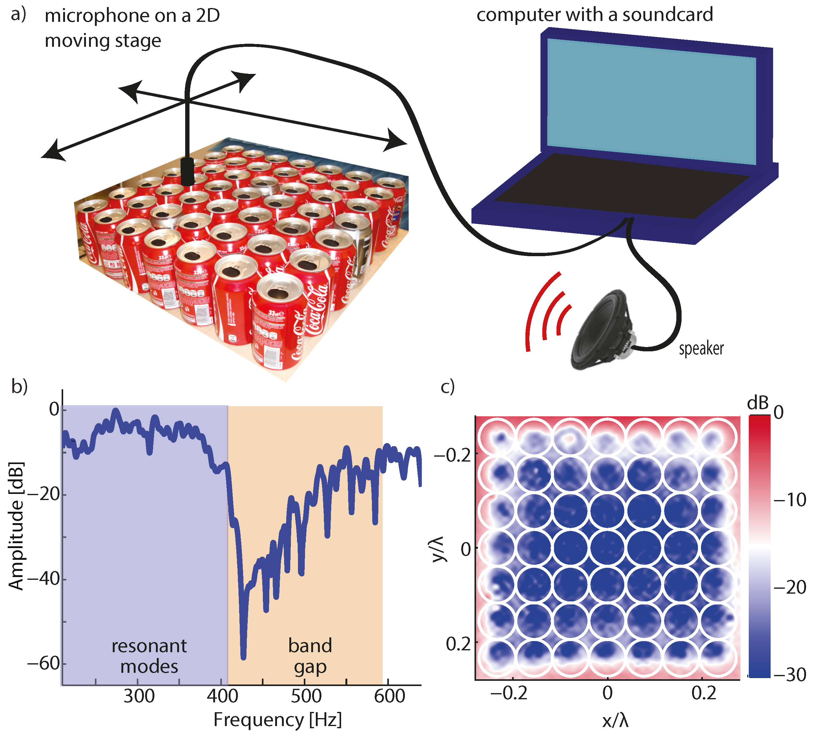 Now, we move to a slightly higher frequency range, just above the resonance frequency of a single soda can. In the previous experiment, we were not able to measure any wavenumber because of the absence of resonant eigenmodes, and therefore we were not able to extract the effective compressibility this way. In order to show what happens in this spectral domain, we represent in Figure 5a the sketch of the new experiment that is conducted. A speaker placed in the far field emits a short pulse that spans frequencies ranging from 200 Hz to 600 Hz and a microphone measures the signal received on top of one can. The spectrum represented in a logarithmic scale (Figure 5b) clearly shows two distinct regimes. Below the resonance frequency of one can (blue shaded area), the transmission is high and evidences the existence of the resonant peaks discussed in the previous section; Above the resonance, the transmission drops down to −60 dB and almost no energy is transmitted from the speaker to the microphone. This frequency region is therefore associated to a so-called band gap (red shaded area). One has to keep in mind that the overall dimension of the soda can remains smaller than the free space wavelength, meaning that the attenuation length is really short. In order to investigate deeper this attenuation effect, we mapped the field at a frequency within the band gap (450 Hz) while we emit from the loudspeaker. We represent in Figure 5c the absolute value of the measured monochromatic field in decibel scale again. This map highlights that the field cannot penetrate inside the soda can metamaterial at this frequency and that the attenuation length is really short since after only one layer of cans the transmission is already reduced by a factor ten. Again, we stress that in the specific case of our two dimensional medium, the destructive interferences responsible for the absence of propagating solutions occur in the near field of the cans. As a consequence if one moves the microphone up the attenuation effect decreases.
