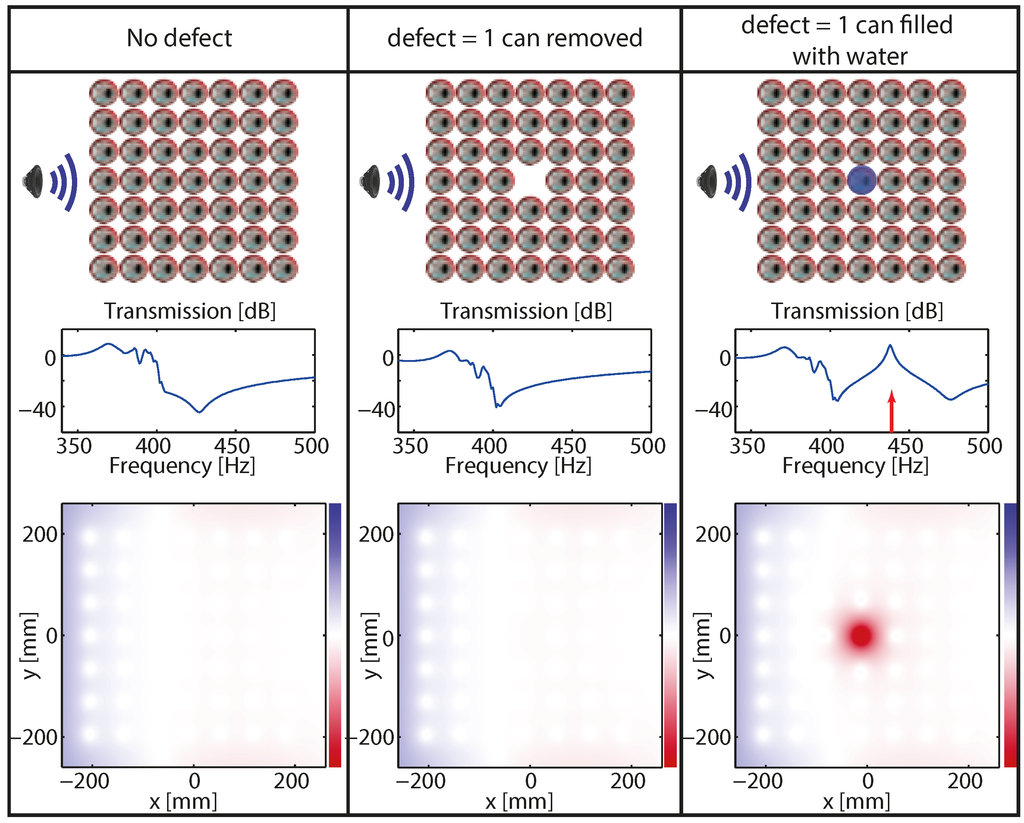 To illustrate the strong difference between those Bragg band gaps and the hybridization one observed in the soda cans medium, we run a set of simulations where we created a defect by removing one can inside the array. We show in Figure 6 (middle) the spectrum of the transmission between an incident plane wave and the location where we removed the soda can. It has to be compared to the one in Figure 6 (left) where no defect within the array has been created. We do not notice any difference between the two spectra in the band gap, and this is confirmed by the typical maps obtained at 440 Hz where no significant changes are observed. This makes a big difference compared to a Bragg based band gap: the defect that we created this way is actually too small to support a resonant mode, while in a phononic crystal removing one scatterer allows the existence of a stationary defect mode since the typical scale of such a defect is the wavelength. In order to tackle this issue, we have to physically introduce a resonant defect inside the soda can medium, which is simply performed by detuning one resonator compared to the rest of the medium. In the case of the soda can medium, this is fairly easy to build this defect resonator: the Helmholtz resonance of a single can is parametrized by the volume of the air cavity. So, we create a detuned resonator just by changing this volume which is realized by filling it with a few centiliters of water. It results in a resonance frequency that is upward shifted, thus falling within the forbidden band. Again, we stress that since the medium is governed by interferences only, akin to phononic crystals, introducing such a defect should not destroy the bulk properties of the metamaterial. The simulation corresponding to a water volume of 6 cL clearly shows that this trick permits to create a defect: the spectrum of the transmission exhibits a resonant peak near 440 Hz and the corresponding field map confirms the existence of confinement at the defect position (Figure 6 (right)).
