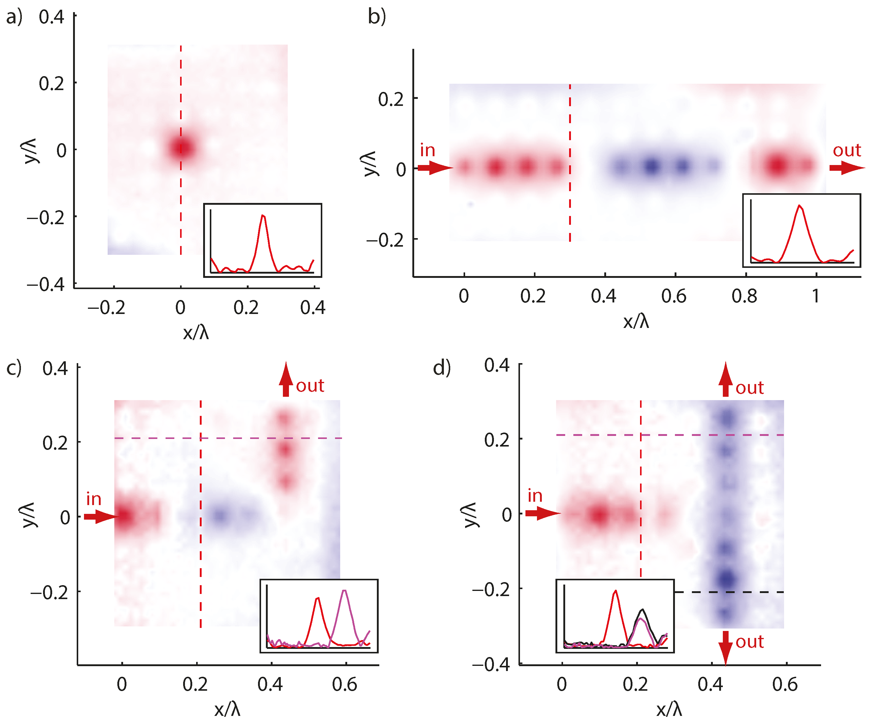Molding the flow of acoustic waves at the deep subwavelength scale. Spatial distributions of the acoustic near field of the sample in amplitude when the speaker emits sounds and (a) the can positioned at (0,0) is filled with 6 cL of water, resulting in a (λ/15) area cavity at 465 Hz; (b) a line of partly filled Helmholtz resonators at constitutes a λ/14 wide waveguide for acoustic waves at 447 Hz; (c) a 90 curved similar waveguide permits to bend with unity efficiency acoustic waves on a λ/14 distance at 451 Hz and (d) a T-shaped waveguide splits acoustic waves into two identical arms with almost equal amplitudes at 450 Hz. The insets show the profiles of the magnitude of the fields along dashed colored lines.