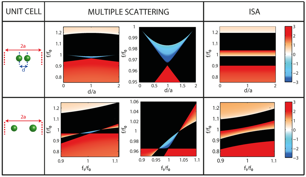 Either for the biperiodic (top) or the bidisperse (bottom) chains, we extracted the effective index of refraction for various strength of the symmetry breaking with a full multiple scattering approach or with the independent scattering approximation (ISA). While the maps with the full multiple scattering calculation show the existence of the negative band (blue color in the map) the ISA does not retrieve it.
