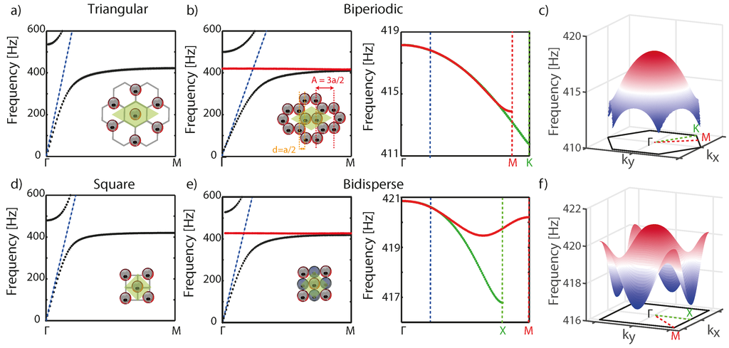 Dispersion relations from numerical simulations with Bloch boundary conditions. (a) a triangular lattice of soda cans displays the polaritonic dispersion behaviour while (b) the honeycomb lattice which consists of the superposition of two triangular ones exhibit the presence of a negative band in the two principal directions of the crystal. (c) The surface plot of this band shows the almost isotropic nature of this band. Similarly, (d) the square lattice of soda cans displays the polaritonic dispersion while (e) a square lattice made of two resonators with two different resonant frequencies shows a negative band. (f) The surface plot for this bidisperse crystal shows less isotropy but near its upper edge it seems isotropic.