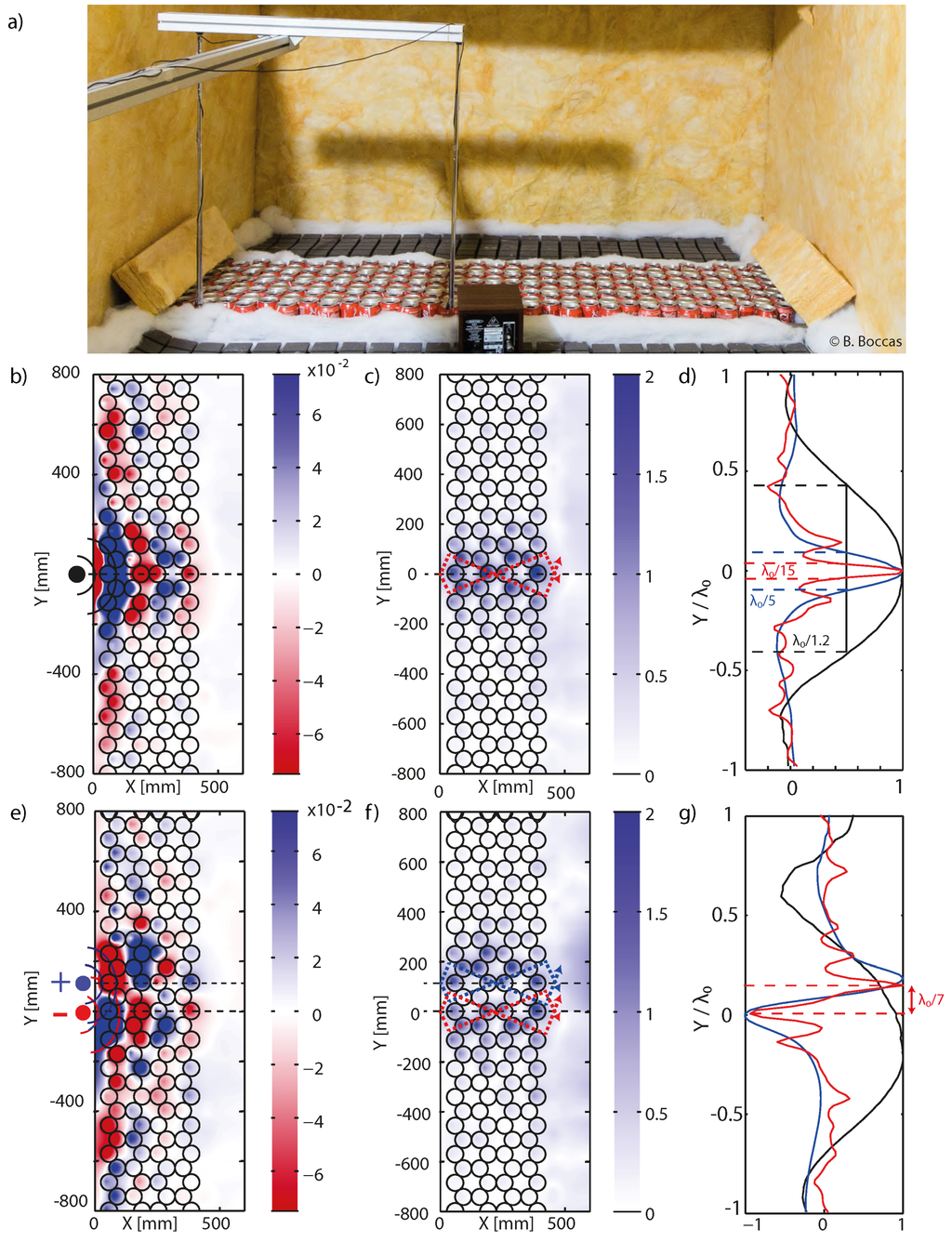 Experimental demonstration of subwavelength focusing and imaging using a flat acoustic lens. (a) A photography of the experimental setup: the flat lens, composed of a compact honey comb arrangement of soda cans, is insonified by a loud speaker placed close to the surface of the medium. Two microphones mounted on a 2D moving stage record the acoustic pressure field less than 1 cm away from the top of the cans. Absorbers surround the lens to prevent from undesired reflections; (b) The real part of the pressure field at 417.5 Hz and (c) its absolute value while compensating for the losses due to the propagation within the lens. The direction of the refracted beams is highlighted with the dashed arrows displaying the features of the negative refraction; (d) The normalized amplitude of the field in the close vicinity of the output surface proves a focusing area of (red) while the source (blue) is wide and the control experiment (black), that is without the lens, wide. The same experiment is conducted with two sources playing sounds out of phase to demonstrate super-resolution (e–g). It clearly proves the same negative refraction results with a resolution of .