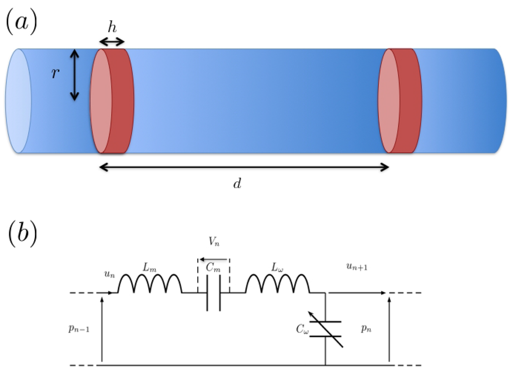 The unit-cell is composed of two parts, one corresponding to the propagation in the tube and the other one to the elastic plate. The resonant elastic plate can be modeled by an circuit, namely the series combination of an inductance and a capacitance , given by
