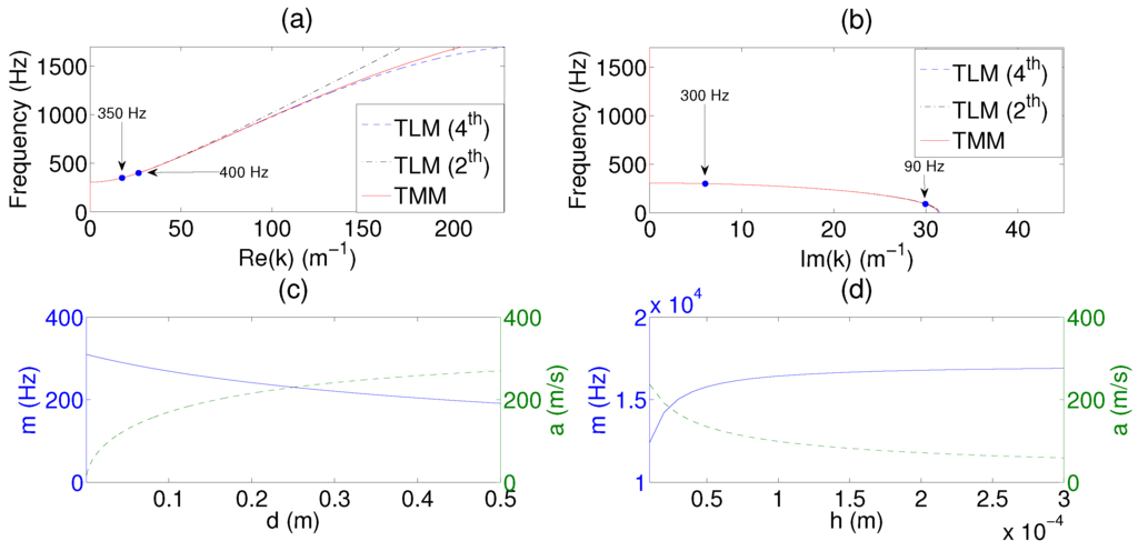 (a) the dispersion relation of system analyzed in this work for the real wavenumber, in the regime of low frequencies. The blue dashed line shows the results from the transmission line approach (keeping up to the ), the red line represents the ones obtained using the transfer matrix method and the black dash-dotted line stands for the dispersion relation obtained by using the transmission line approach keeping only up to . The points in Figure 2a show the frequencies used later in the simulations, 350 Hz and 400 Hz; (b) the dispersion relation of our system in the regime of low frequencies for the imaginary part of wavenumber k. The blue dashed line shows the results from the transmission line approach (keeping up to the ), the red line represents the ones obtained using the transfer matrix method and the black dash-dotted line stands for the dispersion relation obtained by using the transmission line approach keeping only up to . The points in Figure 2b show the frequencies used later in the simulations, 300 Hz and 90 Hz; (c) the influence of the periodicity d of the lattice on the first cut-off frequency m (m is not the resonance frequency of the elastic plates , but in our system it is close to it) (blue line) and the influence of d on the asymptote of the quasi linear part (green dashed line); and (d) the influence of the thickness of the elastic plates h on the first cut-off frequency m (blue line) and the influence of h on the asymptote of the quasi linear part (green dashed line).