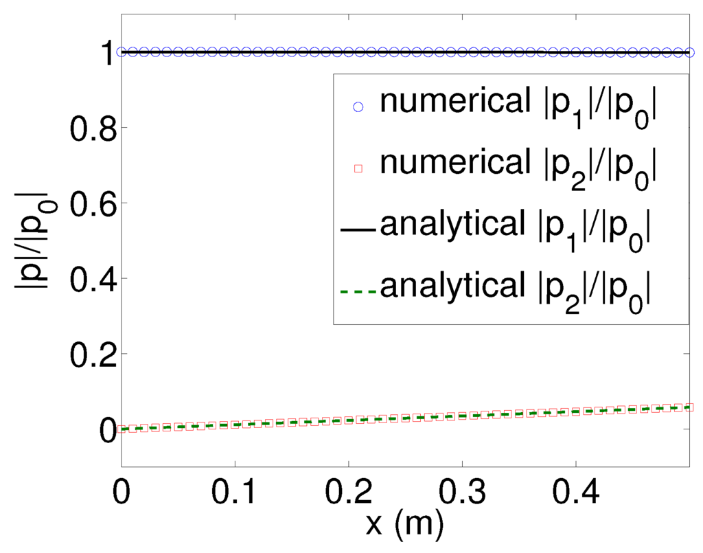 is proportional to the velocity and inversely proportional to the pressure amplitude and source frequency for a fixed medium. Here, the source condition is , where (with being the atmospheric pressure), and is periodic in time with fundamental frequency Hz. If this initial state propagates in a dispersionless waveguide—cf. Figure 3—its shock distance will be around 4 m. In the near source region, the pertinent Fubini solution has certain asymptotic properties [21]. The amplitude of the second harmonic component increases linearly to the propagation distance:
