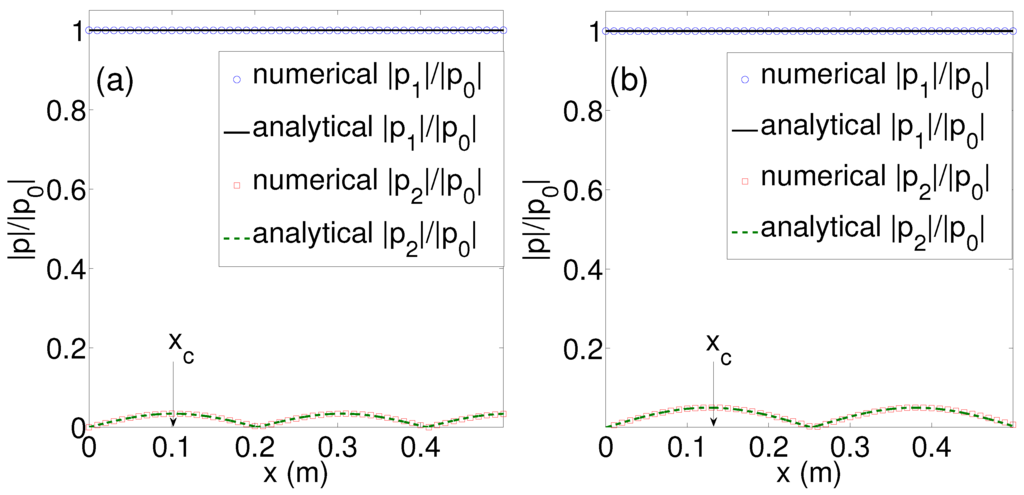 In this work, we consider the response of the elastic plate to be linear and the propagation in the waveguide weakly nonlinear. This is a reasonable approximation, since the amplitudes used in this work are not sufficient to excite nonlinear vibrations of the elastic plate [9,20]. Due to the compressibility of the air, the wave celerity is a nonlinear term, . Thus, we consider that the capacitance is nonlinear and depends on the pressure p. Approximating the celerity as , where is the nonlinear parameter for the case of air (that is ), the pressure-dependent capacitance can be expressed as