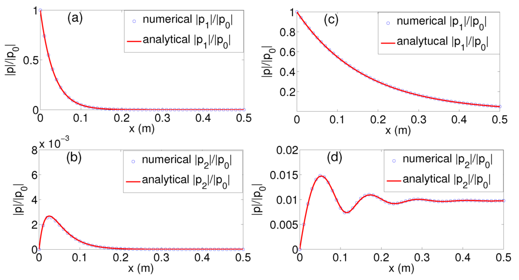 We start by studying the case where both the fundamental component and its second harmonic are in the band gap. In this case, the dispersion relation does not support real solutions, so the corresponding wave number is imaginary, namely , with the imaginary part of the wavenumber, given by the dispersion relation. When is very large, for example at Hz, cf. Figure 5a, the fundamental component decreases exponentially very quickly, namely . The second harmonic component is generated at the beginning of the structure but is very small. In this case, , with the imaginary part of the wavenumber given by the dispersion relation for . The generated frequency Hz is still in the band gap, the corresponding is smaller than that of the fundamental frequency, but still very large. Therefore, we can find a very small at the beginning of the structure, which eventually decreases to zero, see Figure 5b.