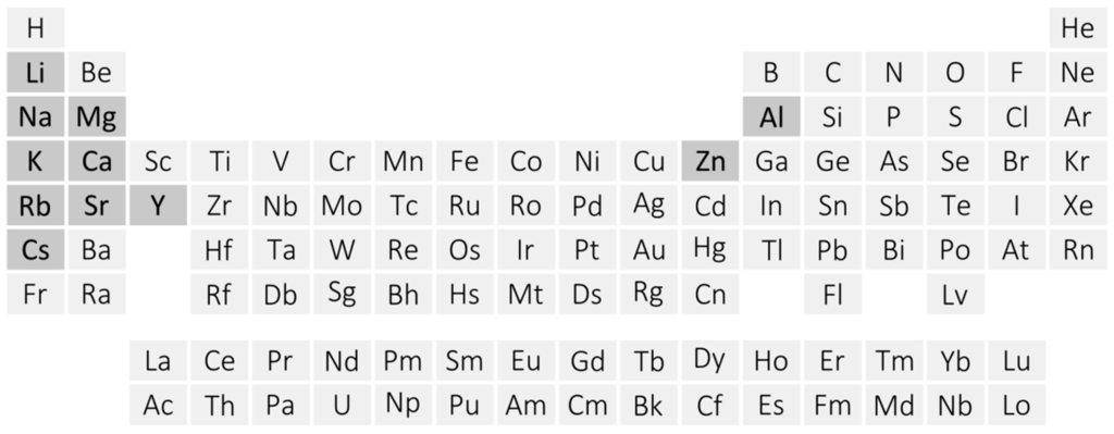 Periodic table showing metals forming mono- or bimetallic amidoborane salts (dark grey).