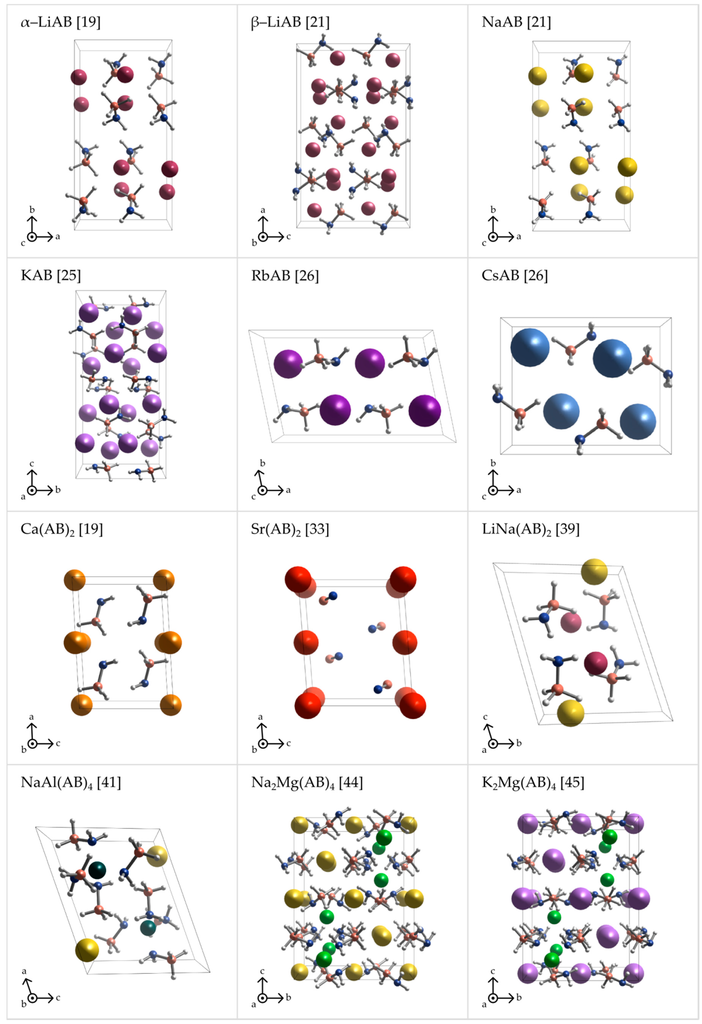 Perspective projections of the crystal structures of various metal amidoboranes: α-LiAB [19], β-LiAB [21], NaAB [21], KAB [25], RbAB [26], CsAB [26], Ca(AB)2 [19], Sr(AB)2 [33], LiNa(AB)2 [39], NaAl(AB)4 [41], Na2Mg(AB)4 [44], and K2Mg(AB)4 [45].