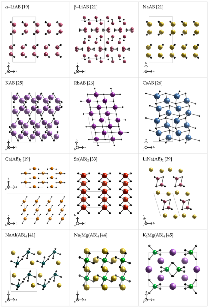 Axonometric projections of the crystal structures of various metal amidoboranes (α-LiAB [19], β-LiAB [21], NaAB [21], KAB [25], RbAB [26], CsAB [26], Ca(AB)2 [19], Sr(AB)2 [33], LiNa(AB)2 [39], NaAl(AB)4 [41], Na2Mg(AB)4 [44], and K2Mg(AB)4 [45]) emphasizing the cation–anion connectivity. Anion is represented by a dummy atom (black ball) sitting at the middle of the BN bond.