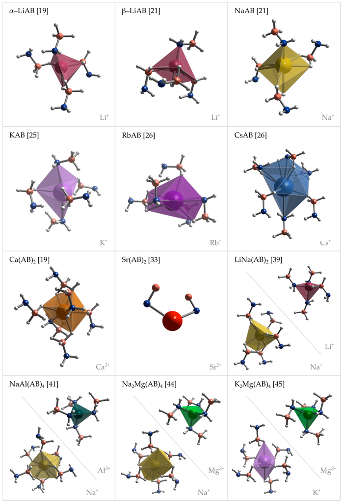 Perspective projections of coordination spheres of metal cations in the crystal structures of various metal amidoboranes: α-LiAB [19], β-LiAB [21], NaAB [21], KAB [25], RbAB [26], CsAB [26], Ca(AB)2 [19], Sr(AB)2 [43], LiNa(AB)2 [39], NaAl(AB)4 [41], Na2Mg(AB)4 [44], and K2Mg(AB)4 [45].