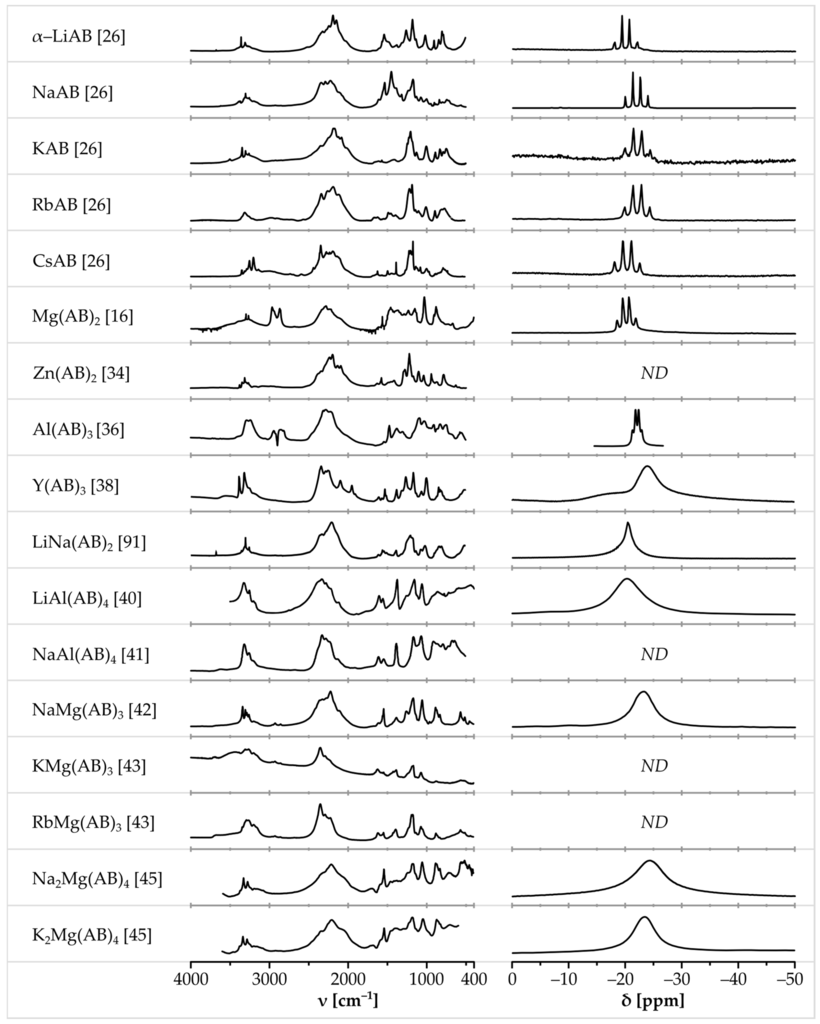Comparison of FTIR spectra (left column) and 11B NMR spectra (right column) of various amidoborane salts. 11B NMR spectra in solution were selected if available. Spectra of Mg(AB)2 adapted from [16] with permission from Allison L. DeGraffenreid. Spectra of: α-LiAB, NaAB, KAB, RbAB and CsAB adapted from [26]; LiAl(AB)4 adapted from [40]; and NaMg(AB)3 adapted from [42], all with permission from The Royal Society of Chemistry. Spectrum of Zn(AB)2 adapted from [34] with permission from Rafal Owarzany. Spectra of Al(AB)3 adapted from [36]. Spectra of Y(AB)3 adapted from [38] with permission from the Journal of Alloys and Compounds. Spectra of NaAl(AB)4 adapted from [41] with permission from John Wiley and Sons. Spectra of KMg(AB)3 and RbMg(AB)3 adapted from [43] with permission from Elsevier. Spectra of Na2Mg(AB)4 and K2Mg(AB)4 adapted with permission from Chua Y.S. et al. Chem. Mater., 2012, 24, 3574. Copyright 2012 American Chemical Society. Spectra of LiNa(AB)2 adapted from [91] with permission from Karol J. Fijalkowski.