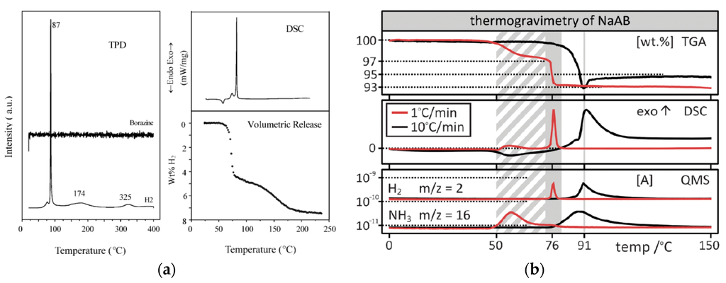 Comparison of thermal decomposition of NaAB presented by: (a) Xiong et al. [22] reporting NaAB as source of borazine-free hydrogen (Left. Reproduced from reference [22] with permission from The Royal Society of Chemistry.); and (b) Fijalkowski et al. [24] reporting contamination of hydrogen with ammonia (Right. Reproduced from reference [24] with permission from the PCCP Owner Societies.). Xiong et al. [22] have not presented any data related to ammonia evolution.