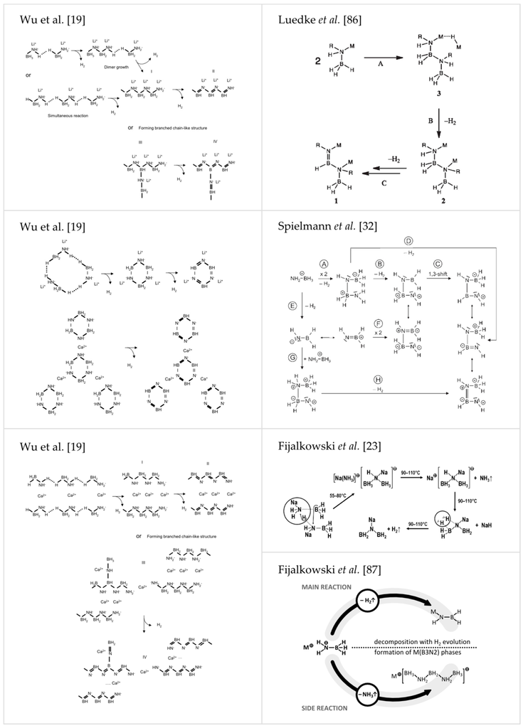 Reproduction of several discussed mechanisms of thermal decomposition of amidoborane salts, proposed by: Wu et al. [19] (Reprinted with permission from Wu et al. J. Am. Chem. Soc. 2008, 130, 14834. Copyright 2008 American Chemical Society.), Spielmann et al. [32] (Reproduced from [32] with permission from John Wiley and Sons.), Luedke et al. [86] (Reprinted with permission from Luedke et al. Inorg. Chem. 2010, 49, 3905. Copyright 2010 American Chemical Society.) and Fijalkowski et al. [23] (Reproduced from reference [23] with permission from The Royal Society of Chemistry.) [87] (Reproduced from reference [87] with permission from the PCCP Owner Societies.).