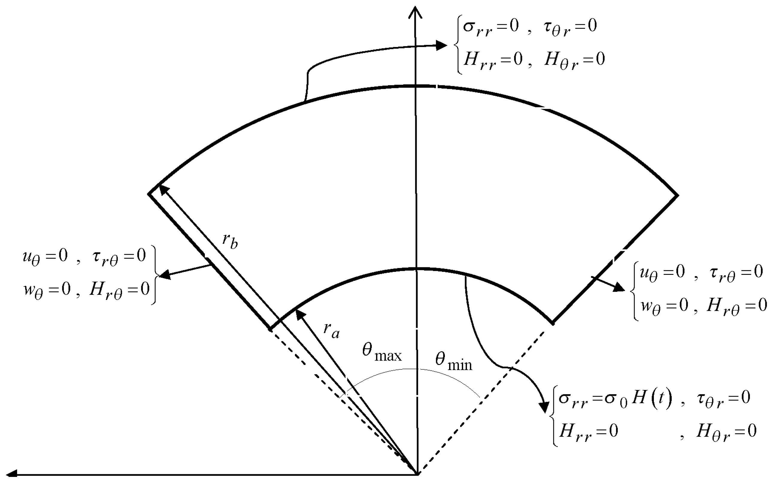 To show some numerical results of the problem, an infinite length sector of a hollow cylinder is assumed with the following mechanical properties and inner radius , outer radius and , , for numerical analysis (see Figure 1).