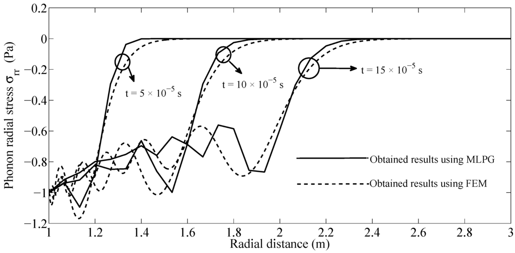 The considered boundary conditions for phonon modes are shown partially in Figure 1 and vanishing initial conditions are assumed. Since the phonon–phason coupling is absent, there is no phason response in the considered example and the dynamic behavior of cylinder is described as classical elastodynamic. The obtained results by the MLPG method for phonon radial stress along the radial direction, and at several time instants are compared with those obtained by finite element method (FEM), which are illustrated in Figure 2. The comparison shows a good agreement between the results.