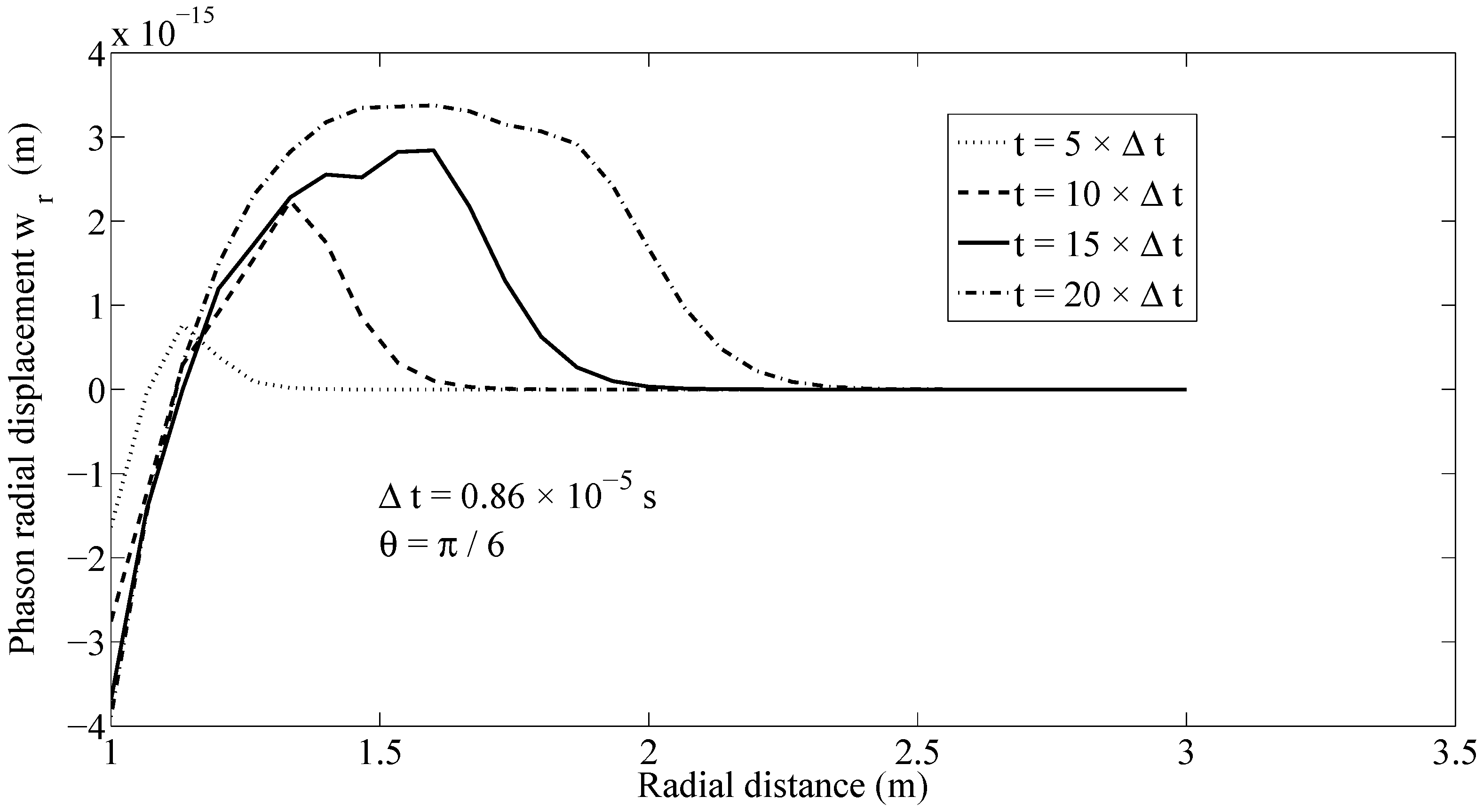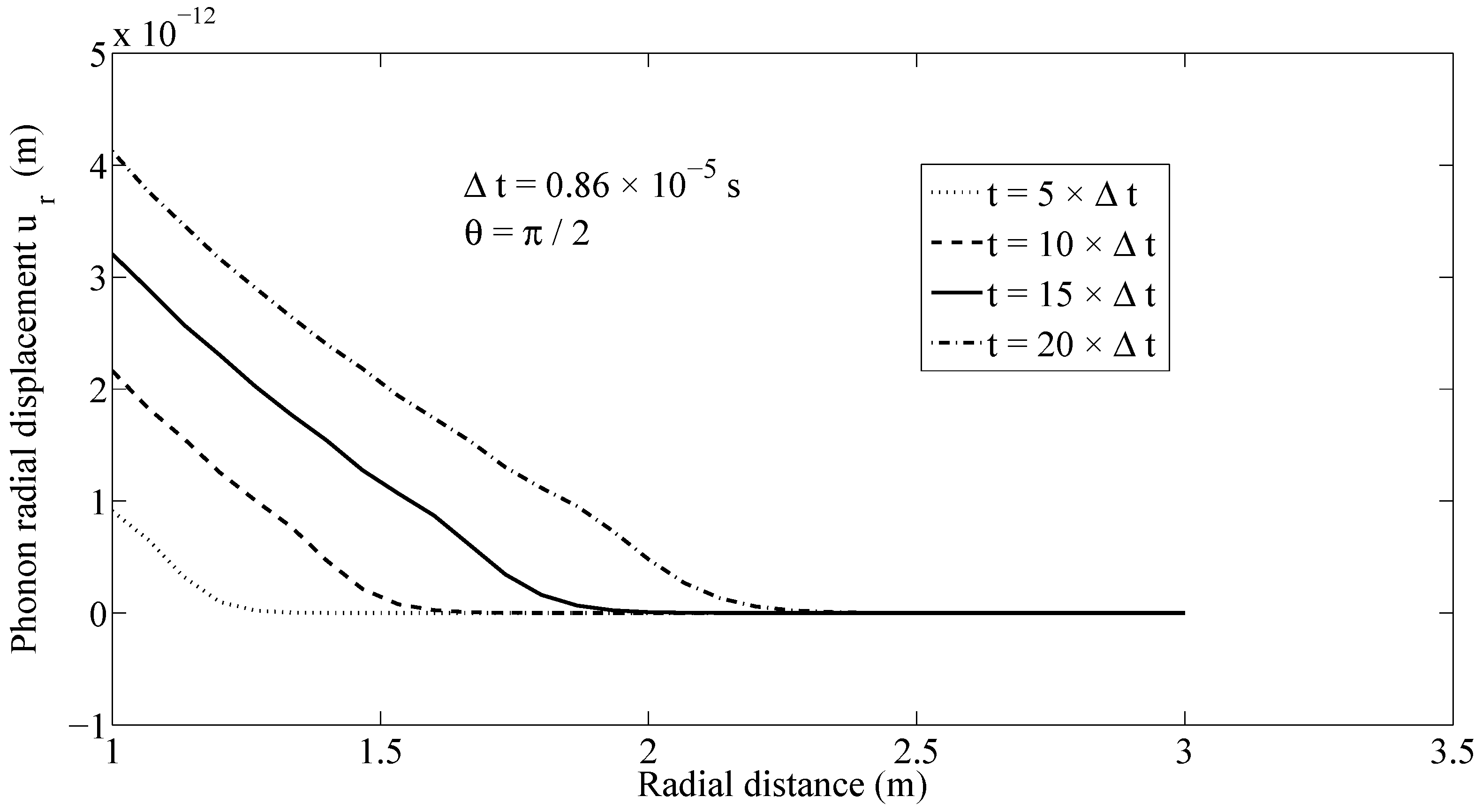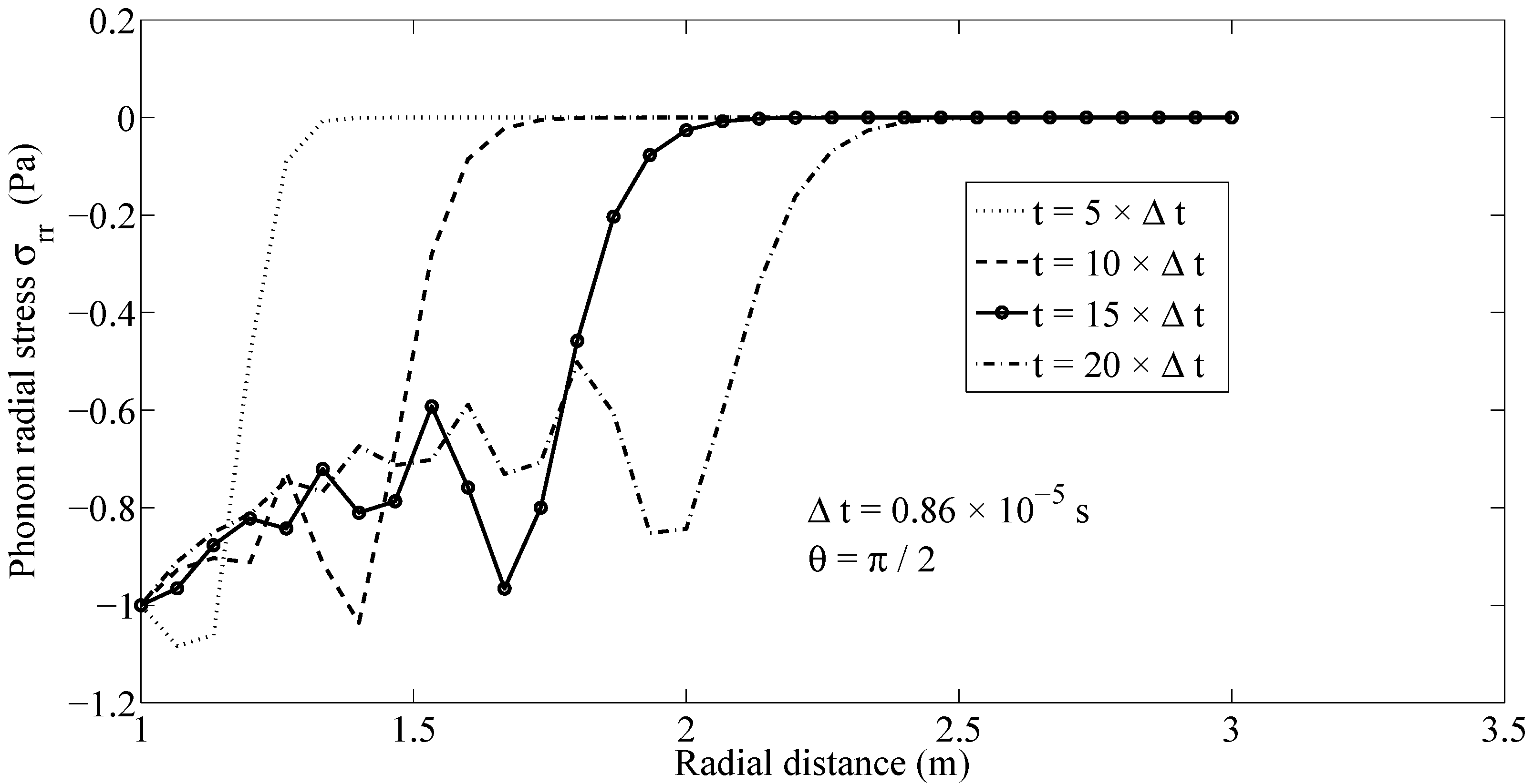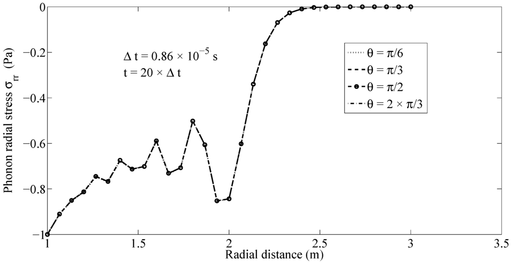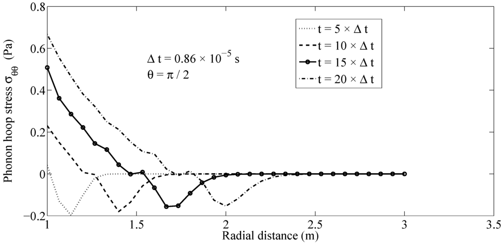 Figure 3 shows the distribution of phonon radial stresses along the ray at several time instants, with the time step being assumed to be . The propagation of phonon radial stress wave fronts can be tracked in Figure 3. Likewise, the wave front of phonon hoop stress is propagated along the ray with a finite speed, as can be seen in Figure 4.