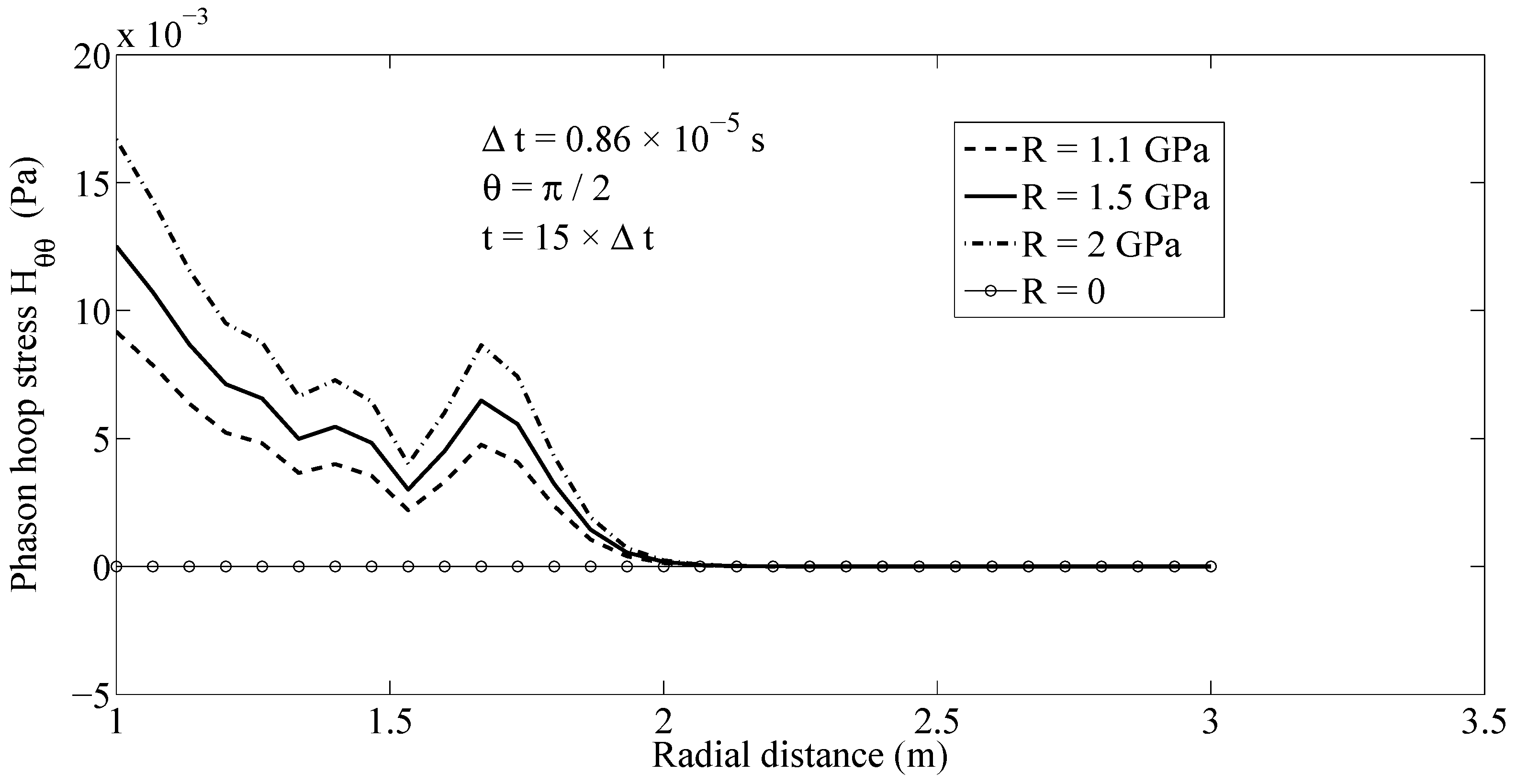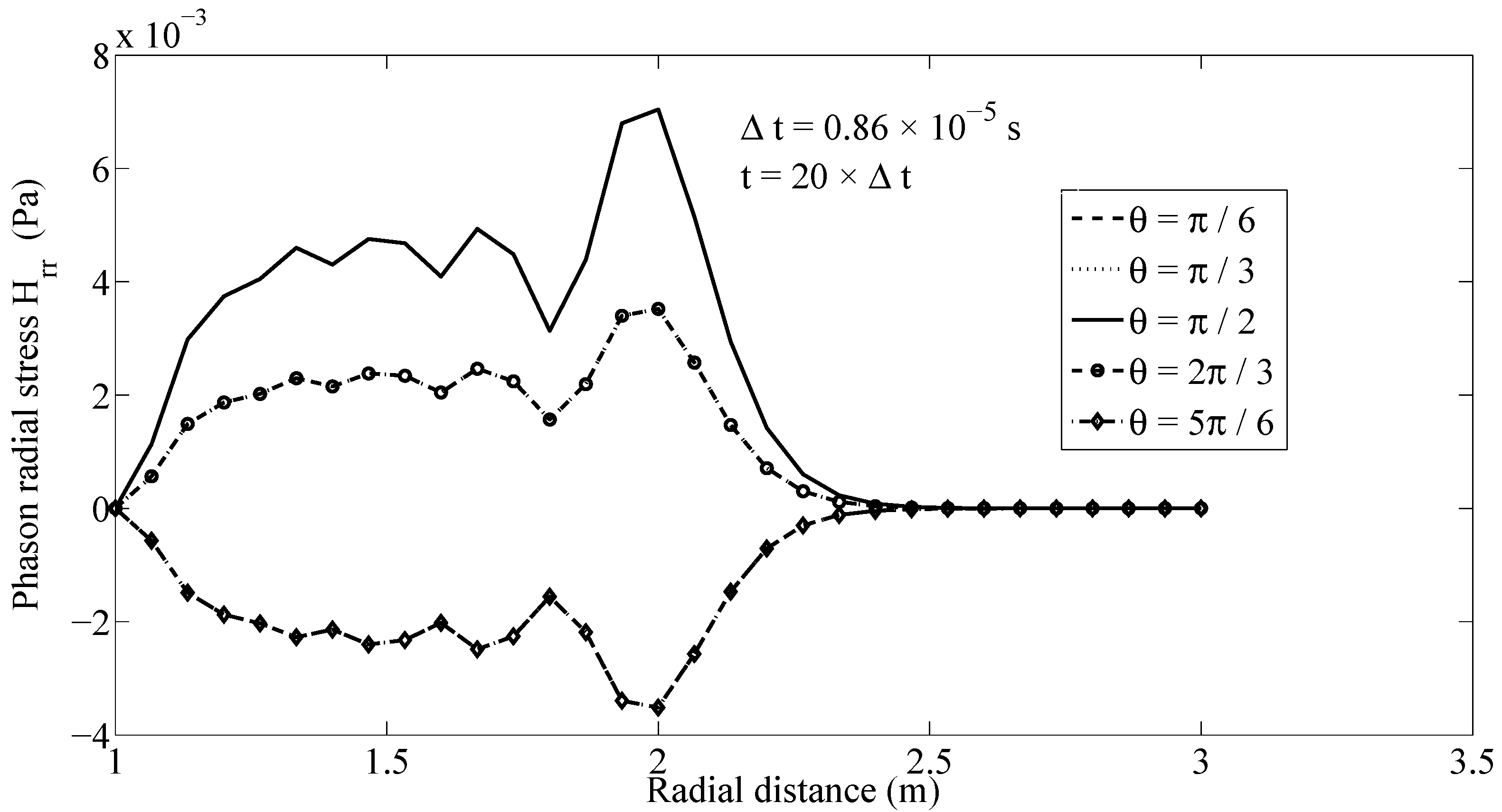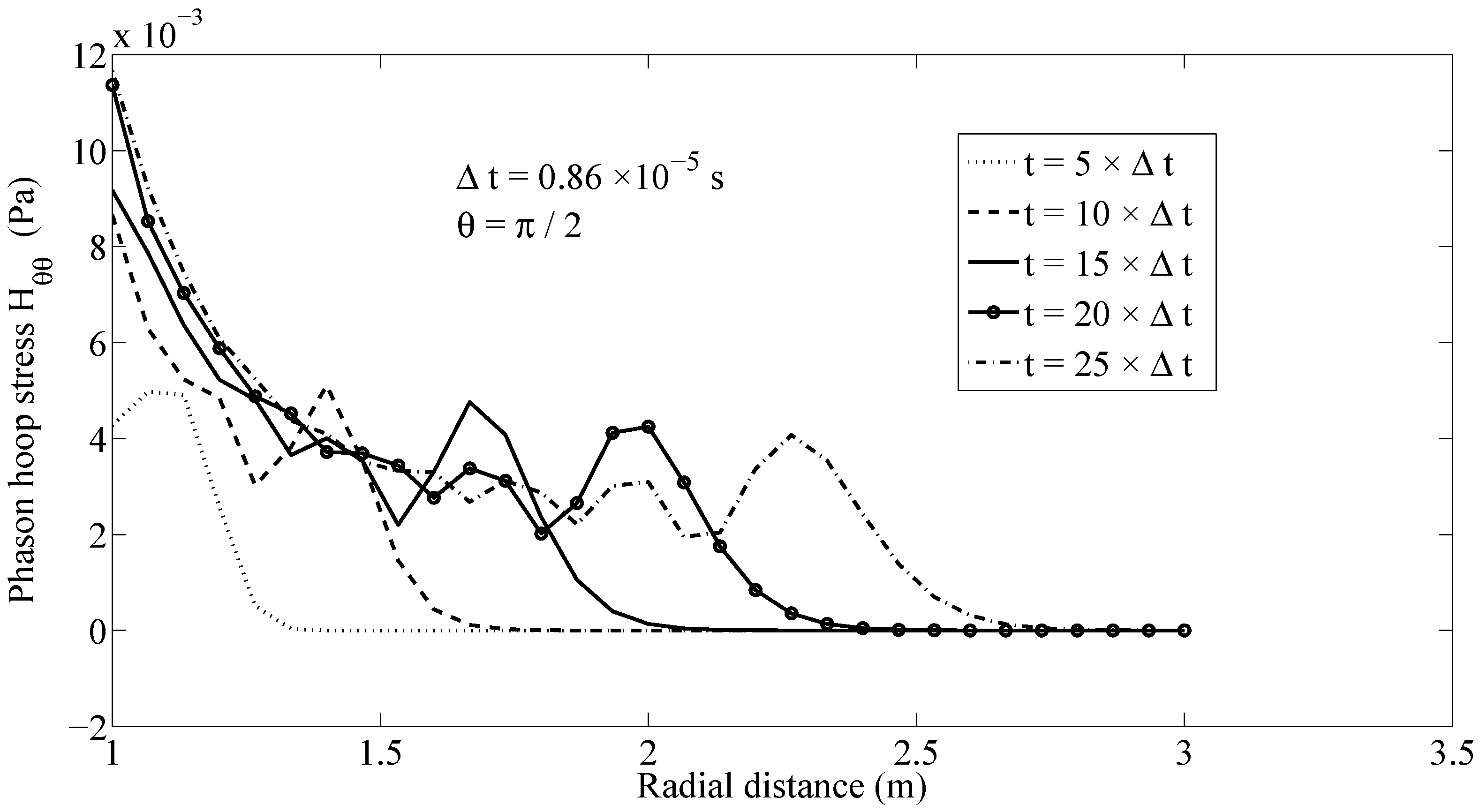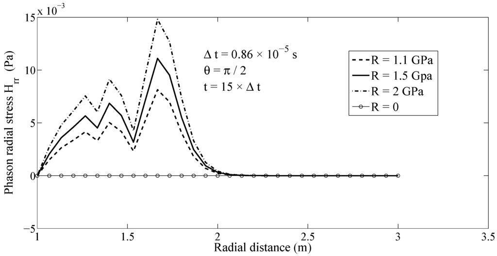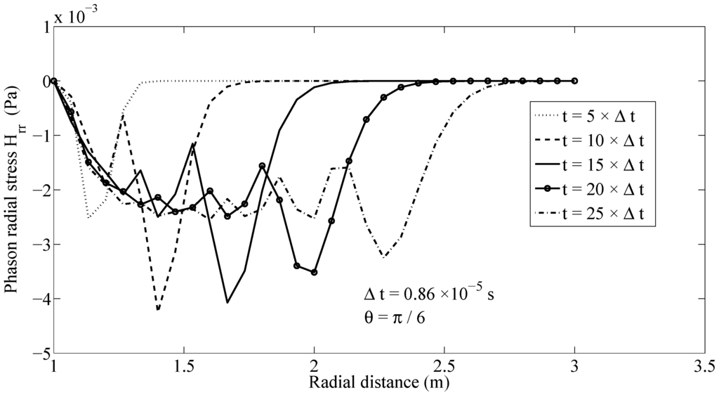 Owing to the coupling, the phason stress field is affected by the considered excitation in phonon stress field. Figure 5 depicts the wave propagation of the phason radial stress field along ray with a finite speed. A similar behavior can be observed also for the phason hoop stress field , as shown in Figure 6. Figure 5 and Figure 6 demonstrate that the presented MLPG method has the capability to simulate the dynamic behavior of both phonon and phason fields and the interaction among them.