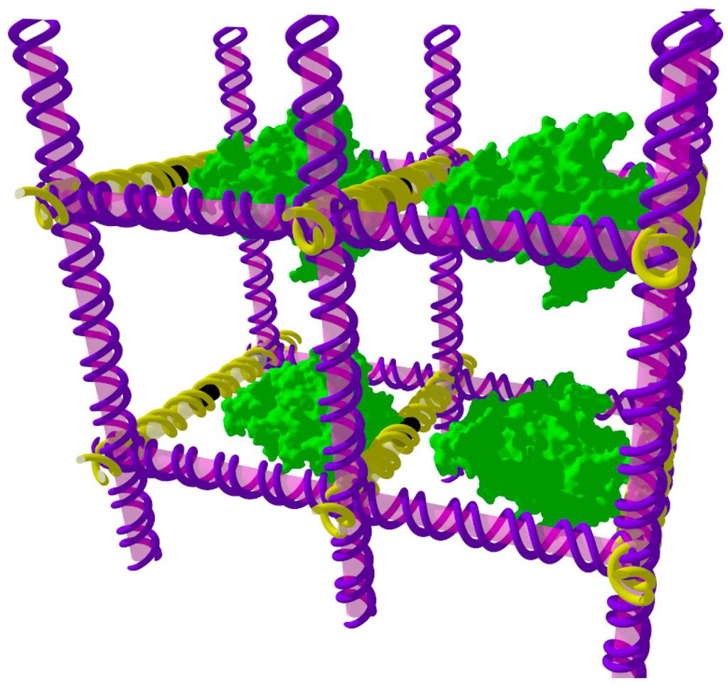 A periodic DNA scaffold. This schematic imagines that DNA (purple/yellow) could be assembled into 3D periodic arrays, or crystals, to which guest molecules such as proteins (green) could be tethered. The guest molecule would then be part of the crystal lattice, allowing its molecular structure to be determined by X-ray diffraction. This idea sparked the field of DNA nanotechnology.