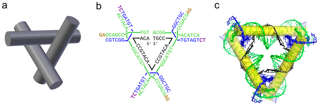 The tensegrity triangle motif. (a) Cylindrical representation of a tensegrity triangle, highlighting the three independent linear directions of the cylinders; (b) One example of three-fold symmetrized DNA tensegrity triangle. The central strand is in black, the edge strands are in green, and the cross-over strands in blue. 2 nt sticky ends are outlined in red; (c) The single DNA tensegrity triangle motif described by the crystal structure (PDBID: 3GBI). Strands are colored as in (b) and yellow cylinders connect the helix ends to show the three independent linear directions that multiple motifs extend into a 3D lattice.