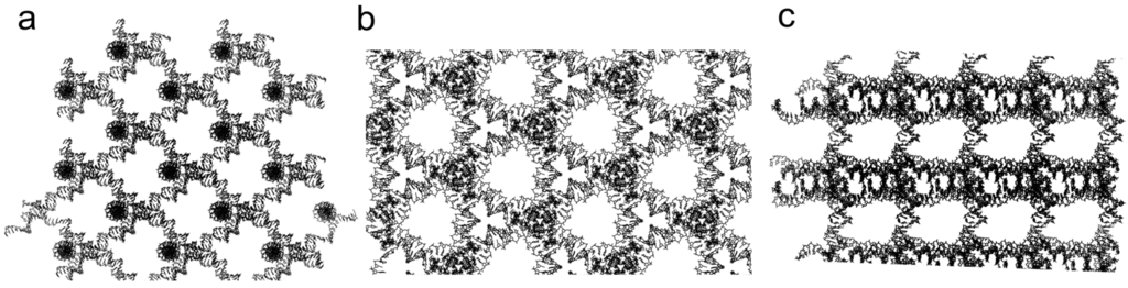 Solvent channels. The tensegrity triangle crystals form multiple solvent channels that run through the crystal in multiple directions. (a) Solvent channels that run along each helical axis of the motif; (b,c) Two other channels that run through the crystal.