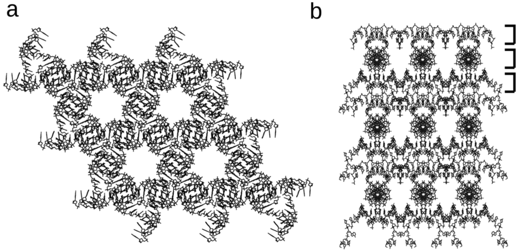Solvent channels of the 13-mer lattice. Solvent channels run through the 13-mer crystals in multiple directions. (a) Solvent channels running down the six-fold axis are ~2 nm in diameter; (b) Solvent channels run along each of the three helical layers (shown by brackets) that repeat down the six-fold axis.